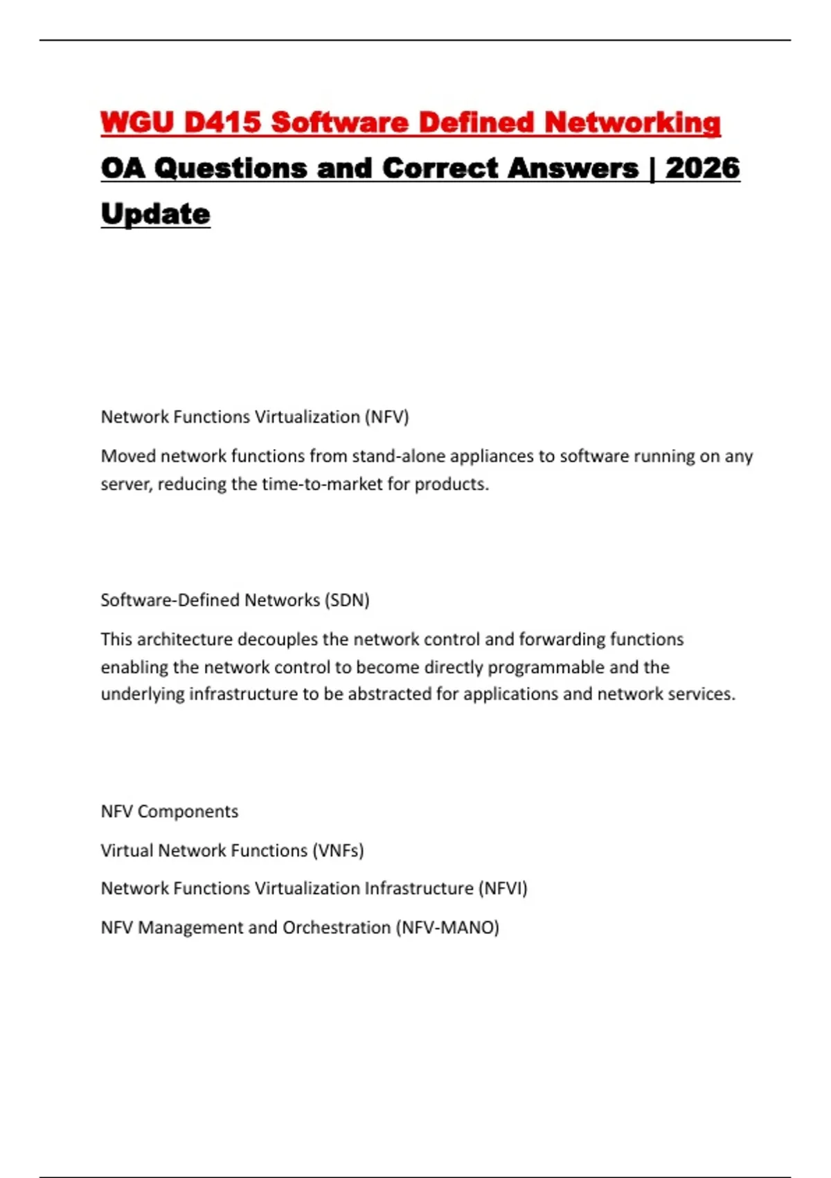 This document provides a detailed and structured overview of the WGU D415 Software-Defined Networking (SDN) Objective Assessment, including clearly explained concepts and correct answers aligned with the 2026 update. It covers SDN and NFV fundamentals, OpenStack modules, controllers, OpenFlow, virtualization, security models, NIST recommendations, automation tools, and exam-relevant definitions. The content is ideal as complete study material or a final revision guide for students preparing for the OA.