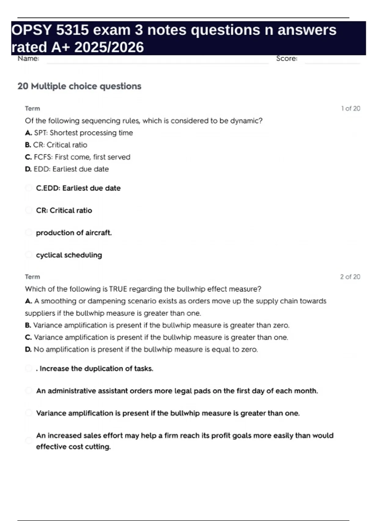 OPSY 5315 exam 3 notes questions n answers rated A+ 2025/2026