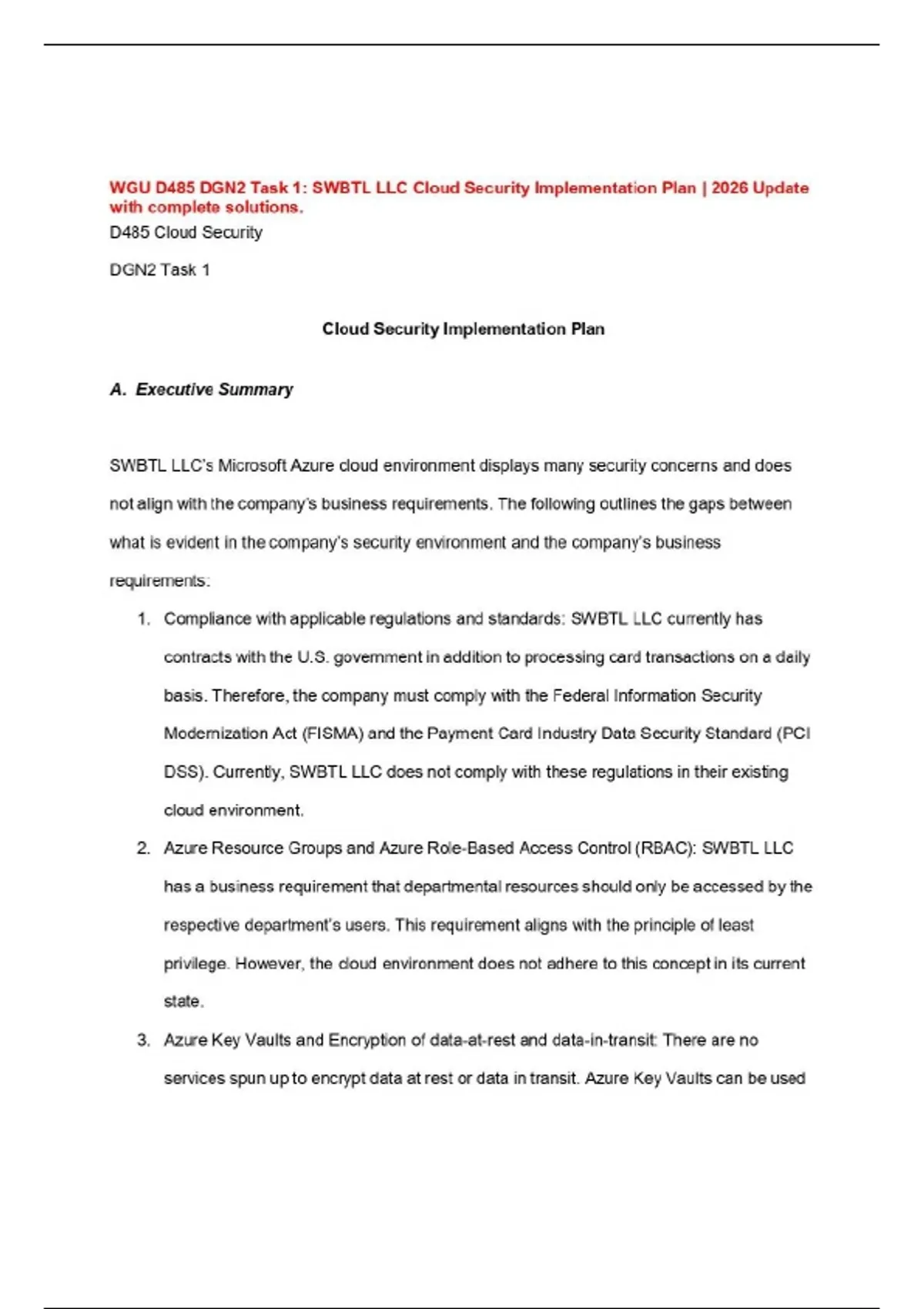 WGU D485 DGN2 Task 1: SWBTL LLC Cloud Security Implementation Plan | 2026 Update with complete solutions.