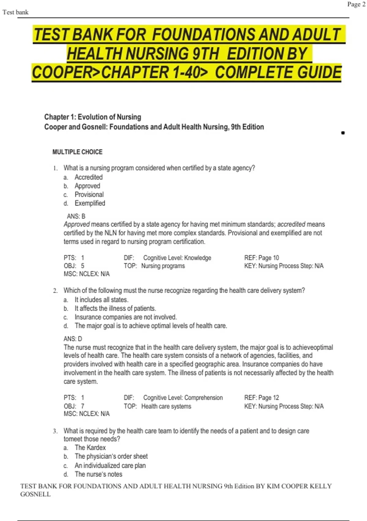 TEST BANK FOR FOUNDATIONS AND ADULT HEALTH NURSING 9TH EDITION BY COOPER>CHAPTER 1-40> COMPLETE GUIDE TEST BANK FOR FOUNDATIONS AND ADULT HEALTH NURSING 9TH EDITION BY COOPER>CHAPTER 1-40> COMPLETE GUIDE