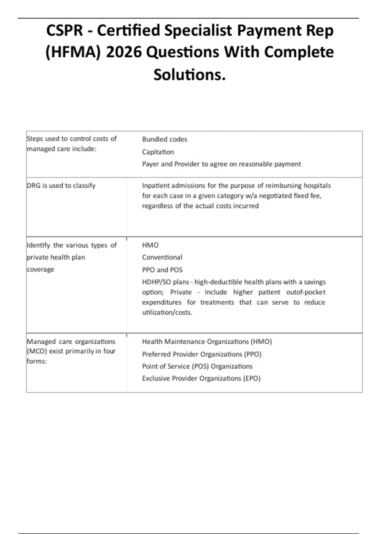 CSPR - Certified Specialist Payment Rep (HFMA) 2026 Questions With Complete Solutions. Flashcards