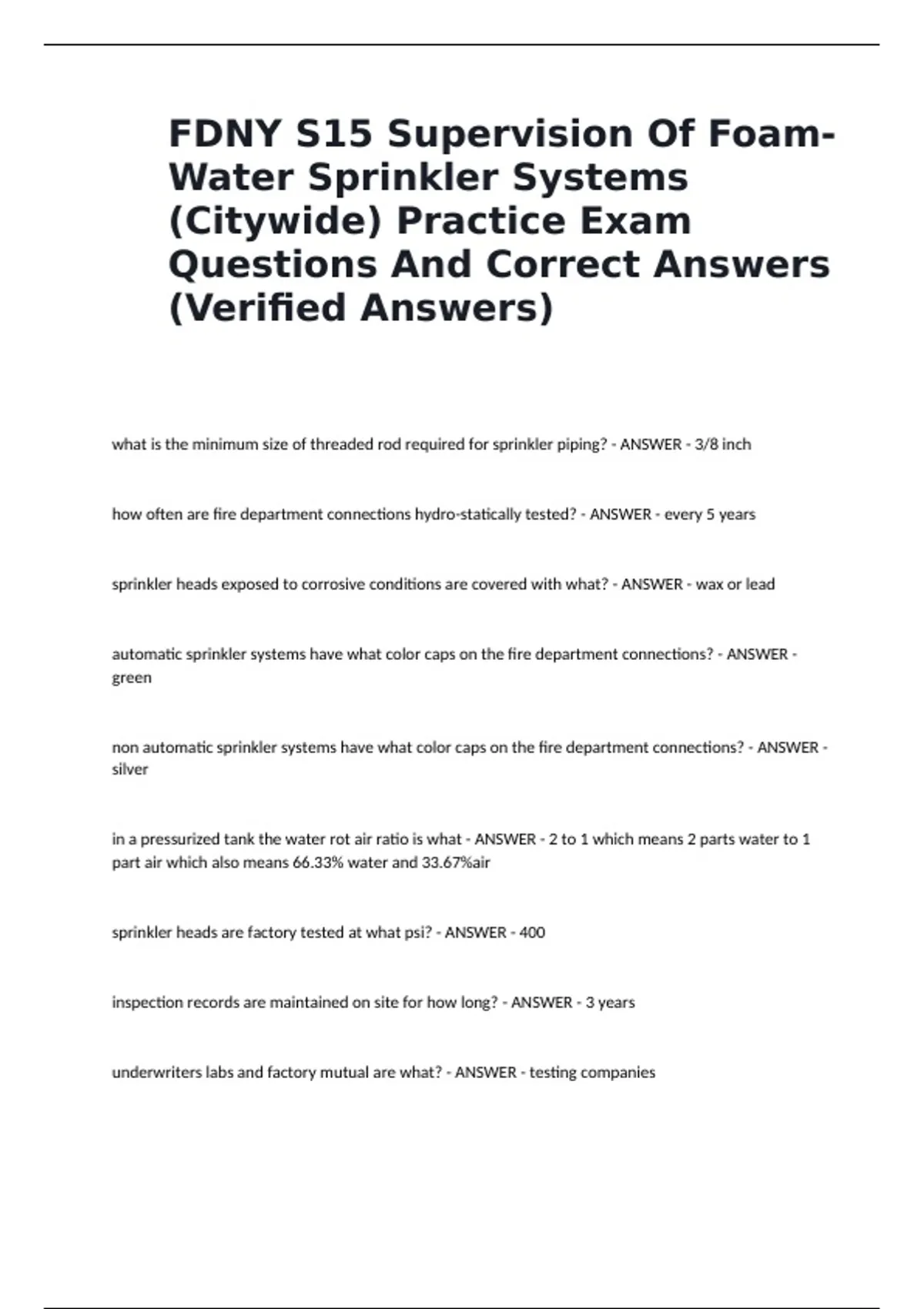 FDNY S15 Supervision Of Foam-Water Sprinkler Systems (Citywide) Practice Exam Questions And Correct Answers (Verified Answers)
