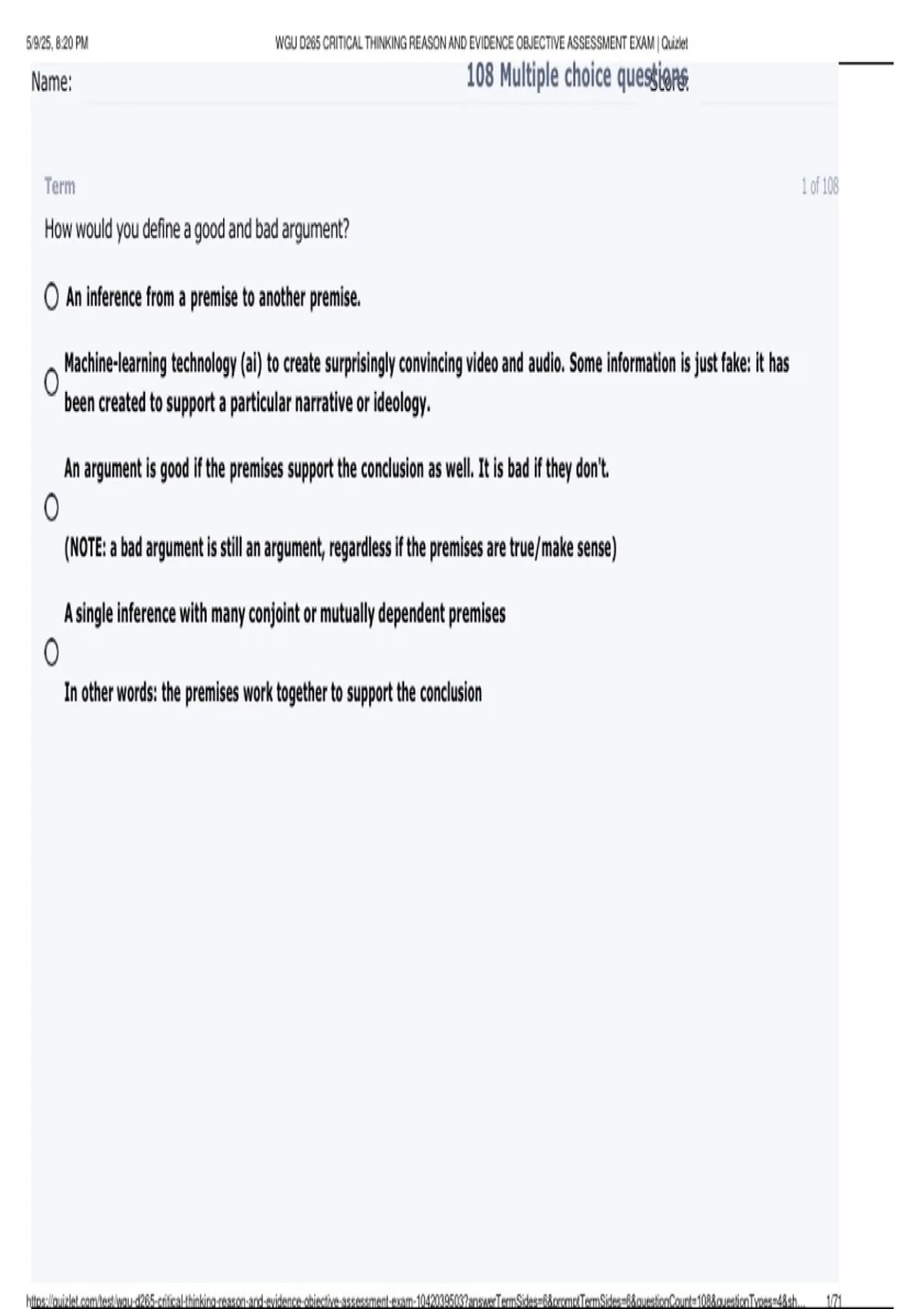 , 5/9/25, 8:20 PM WGU D265 CRITICAL THINKING REASON AND EVIDENCE OBJECTIVE ASSESSMENT EXAM | Quizlet