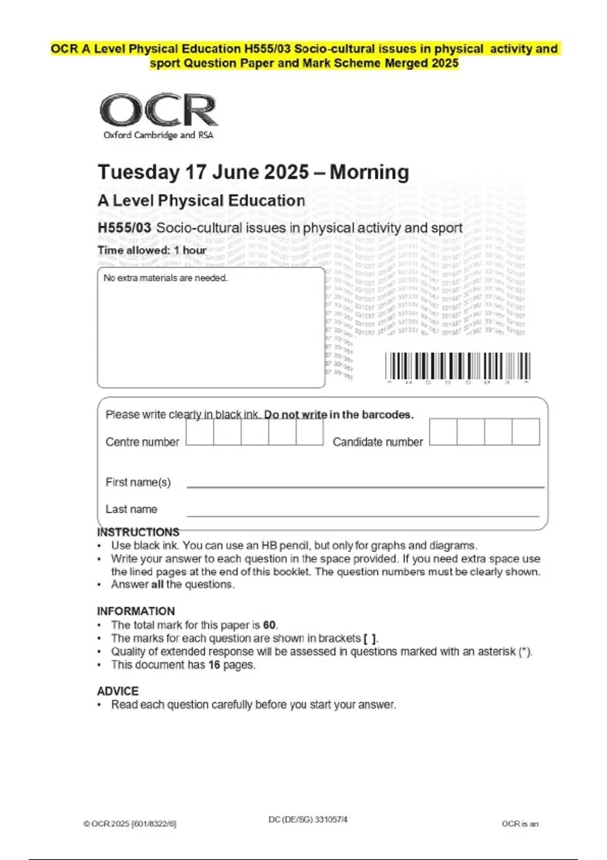 OCR A Level Physical Education H555/03 Socio-cultural issues in physical activity and sport Question Paper and Mark Scheme Merged 2025