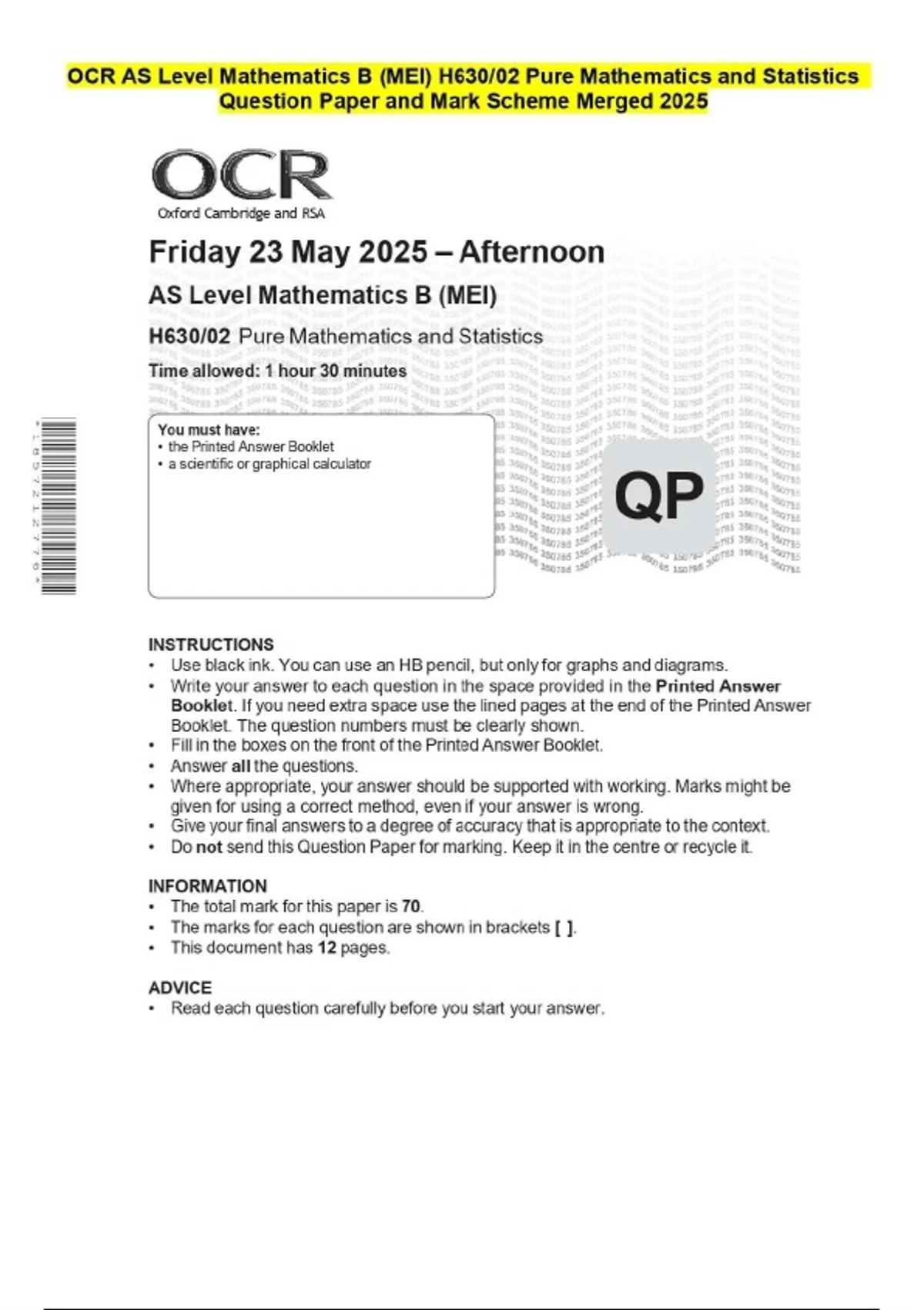 PACKAGE DEAL OCR AS Mathematics Question Paper and Mark Scheme 2025
