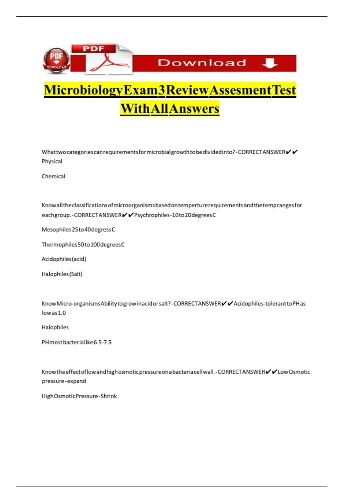 Know Micro-organisms Ability to grow in acid or salt? - CORRECT ANSWER✔✔Acidophiles-tolerant to PH as