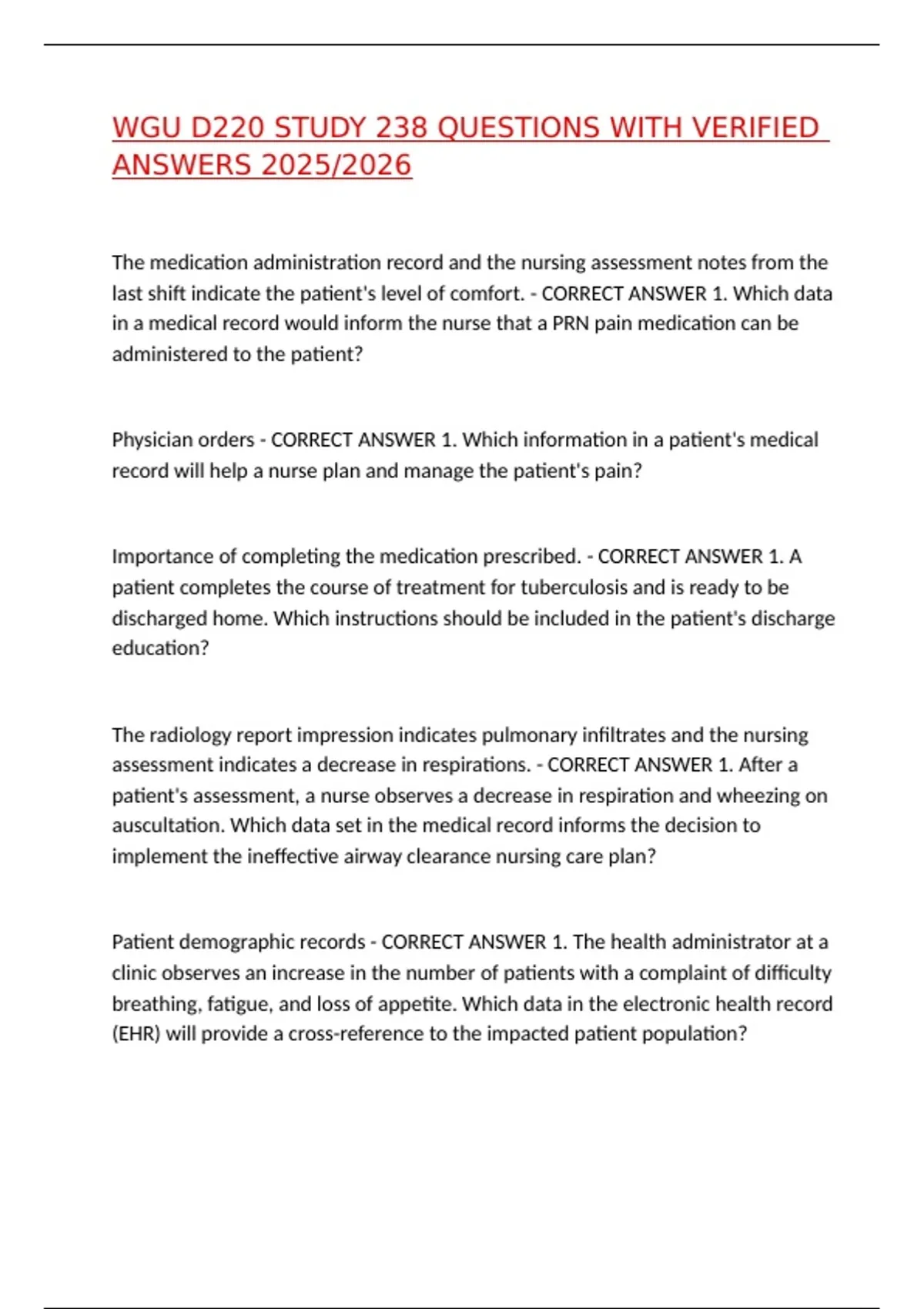 WGU D220 STUDY 238 QUESTIONS WITH VERIFIED ANSWERS 2025/2026 The medication administration record and the nursing assessment notes from the last shift indicate the patient's level of comfort. - CORRECT ANSWER 1. Which data in a medical record would inform the nurse that a PRN pain medication can be administered to the patient? Physician orders - CORRECT ANSWER 1. Which information in a patient's medical record will help a nurse plan and manage the patient's pain? Importance of completing the medication prescribed. - CORRECT ANSWER 1. A patient completes the course of treatment for tuberculosis and is ready to be discharged home. Which instructions should be included in the patient's discharge education? The radiology report impression indicates pulmonary infiltrates and the nursing assessment indicates a decrease in respirations. - CORRECT ANSWER 1. After a patient's assessment, a nurse observes a decrease in respiration and wheezing on auscultation. Which data set in the medical record informs the decision to implement the ineffective airway clearance nursing care plan? Patient demographic records - CORRECT ANSWER 1. The health administrator at a clinic observes an increase in the number of patients with a complaint of difficulty breathing, fatigue, and loss of appetite. Which data in the electronic health record (EHR) will provide a cross-reference to the impacted patient population? Graphical trending - CORRECT ANSWER 1. Which view in the electronic health record (EHR) confirms a patient's blood pressure is stabilizing? Nursing flowsheet and intake and output record - CORRECT ANSWER 1. After a patient's initial assessment, a nurse observes an increase in edema, bilateral crackles, and persistent cough. Which data set in the medical record from the last shift informs the decision to implement the fluid volume overload care plan? Laboratory records - CORRECT ANSWER 1. Which data set in the electronic health record (EHR) will assist in evaluating the number of positive influenza tests at a facility within the past year? Patients that are recovering well after a full night of sleep. - CORRECT ANSWER 1. Which patients are ideally positioned to fully engage in their care? An elderly person - CORRECT ANSWER 1. A nurse is teaching a patient-centered health education course at a hospital. As an informatics nurse leveraging technology to help improve patient understanding, which learner would be more likely to have a low health literacy and require more focus? Improving health literacy leads to better patient outcomes. - CORRECT ANSWER 1. What is true about improving health literacy?