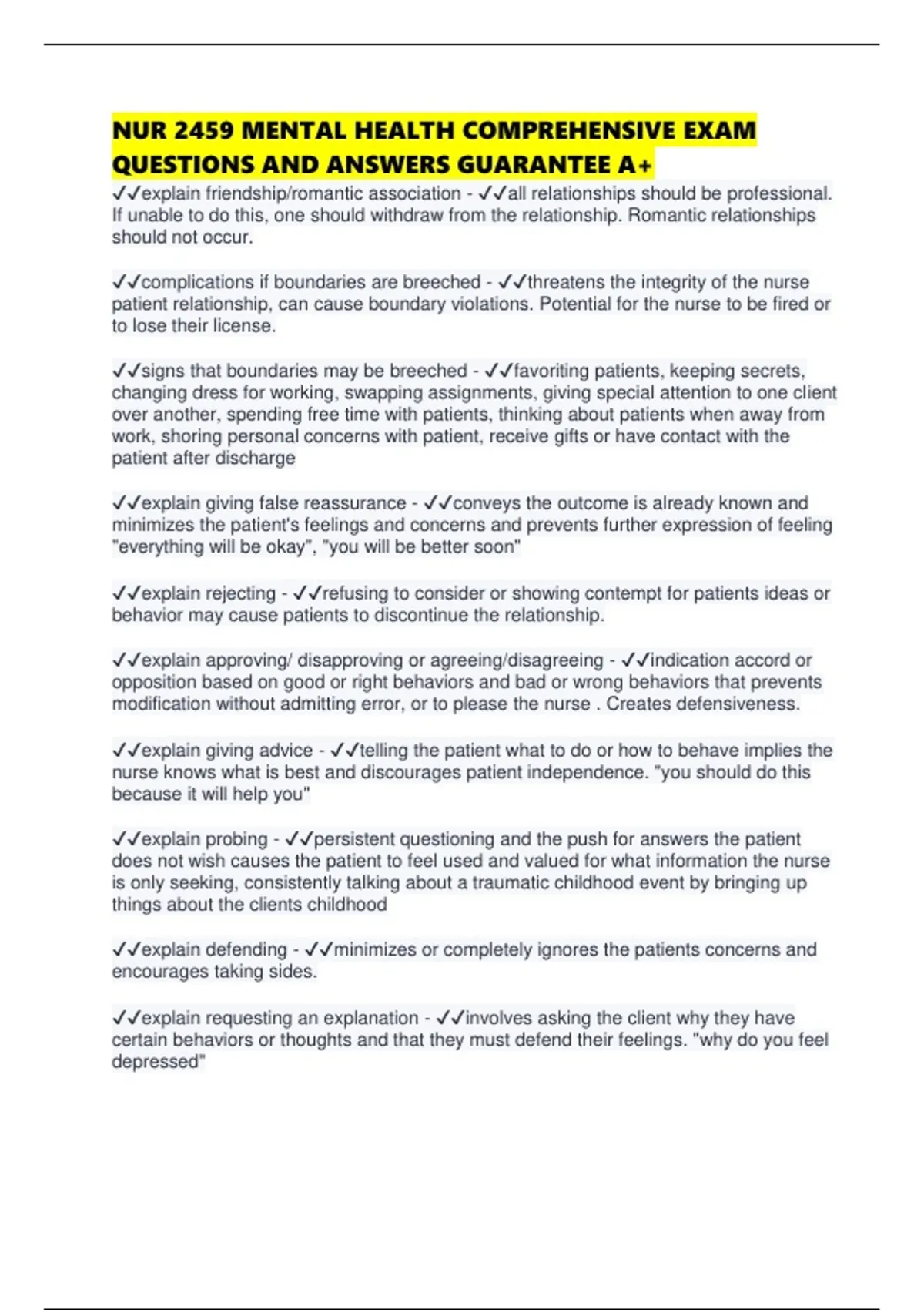 NUR 2459 MENTAL HEALTH COMPREHENSIVE EXAM QUESTIONS AND ANSWERS GUARANTEE A+