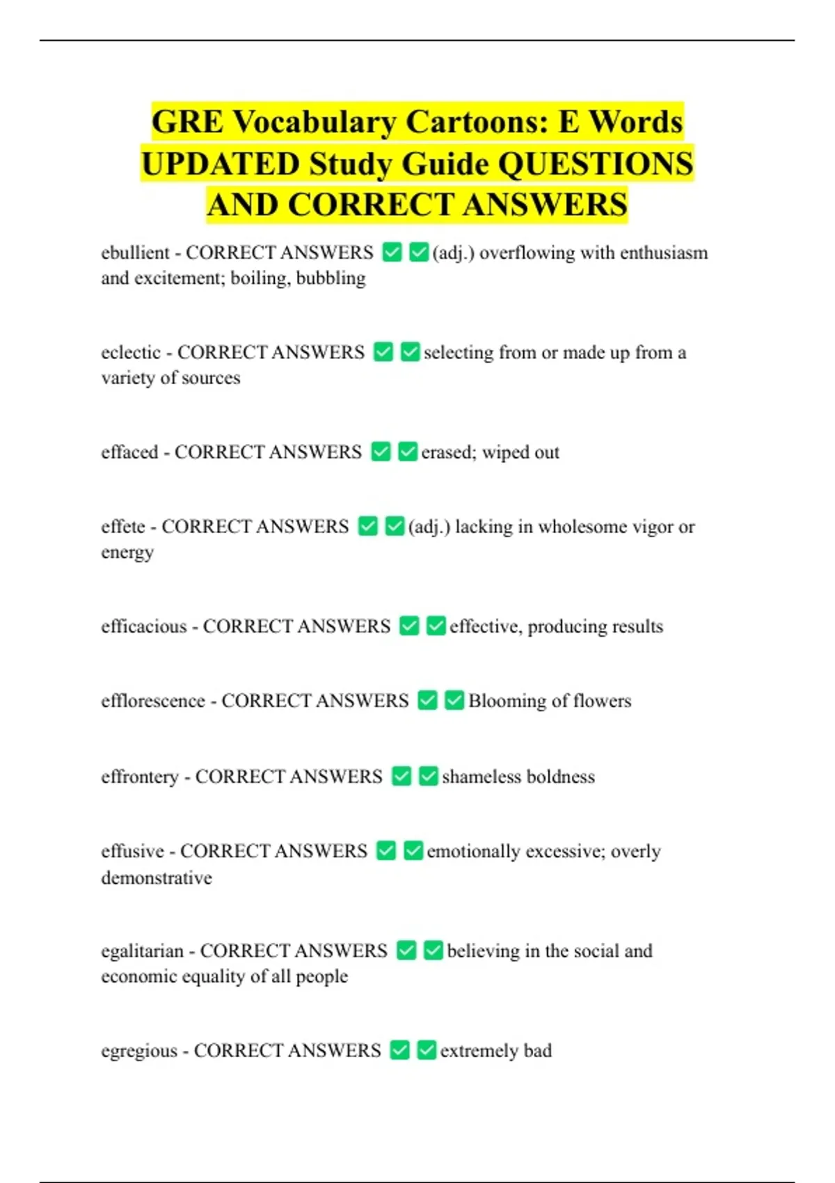 GRE Vocabulary Cartoons: E Words UPDATED Study Guide QUESTIONS AND CORRECT ANSWERS ebullient - CORRECT ANSWERS and excitement; boiling, bubbling eclectic - CORRECT ANSWERS variety of sources effaced - CORRECT ANSWERS effete - CORRECT ANSWERS energy efficacious - CORRECT ANSWERS efflorescence - CORRECT ANSWERS effrontery - CORRECT ANSWERS effusive - CORRECT ANSWERS demonstrative egalitarian - CORRECT ANSWERS economic equality of all people egregious - CORRECT ANSWERS (adj.) overflowing with enthusiasm