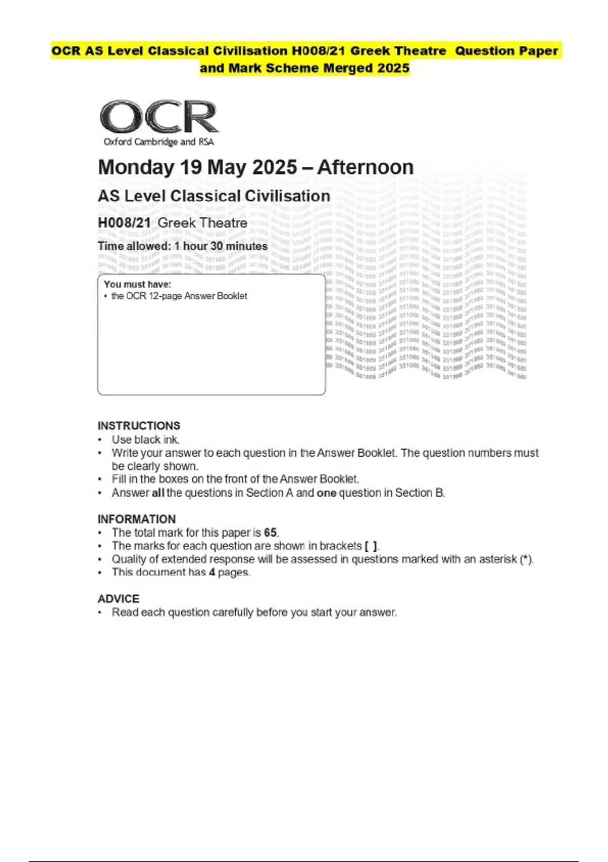 OCR AS Level Classical Civilisation H008/21 Greek Theatre Question Paper and Mark Scheme Merged 2025