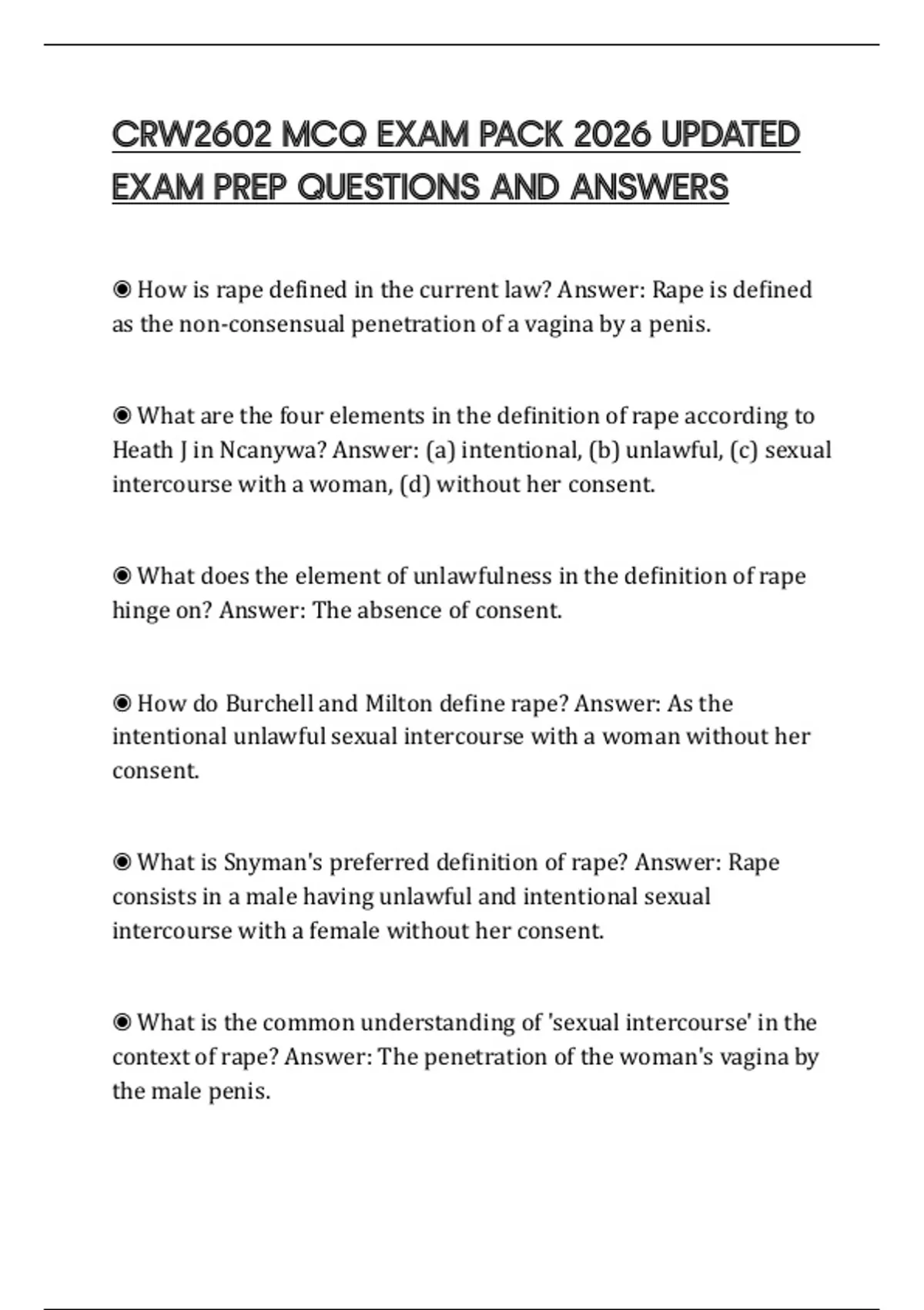◉ What is Snyman's preferred definition of rape? Answer: Rape