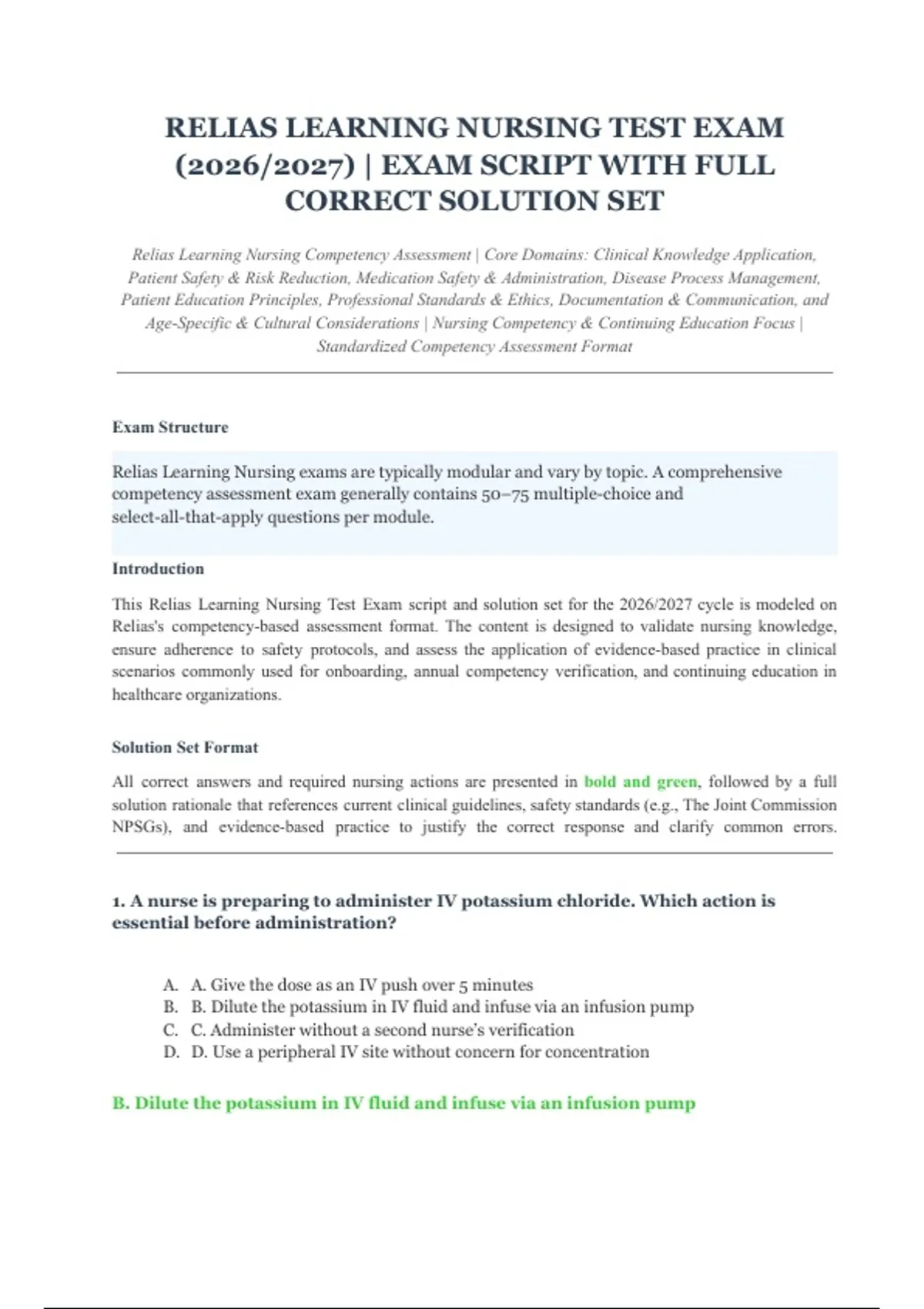 This document contains the Relias Learning Nursing competency test exam with a complete, verified solution set, designed for competency validation and continuing education. It covers clinical knowledge application, patient safety and risk reduction, medication safety and administration, disease process management, patient education principles, professional standards and ethics, documentation and communication, and age-specific and cultural considerations. The material follows a standardized Relias competency assessment format and supports nursing skill evaluation for the 2026/2027 cycle.