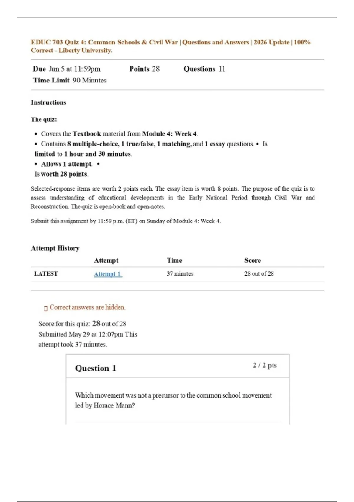 EDUC 703 Quiz 4: Common Schools & Civil War | Questions and Answers | 2026 Update | 100% Correct - Liberty University.