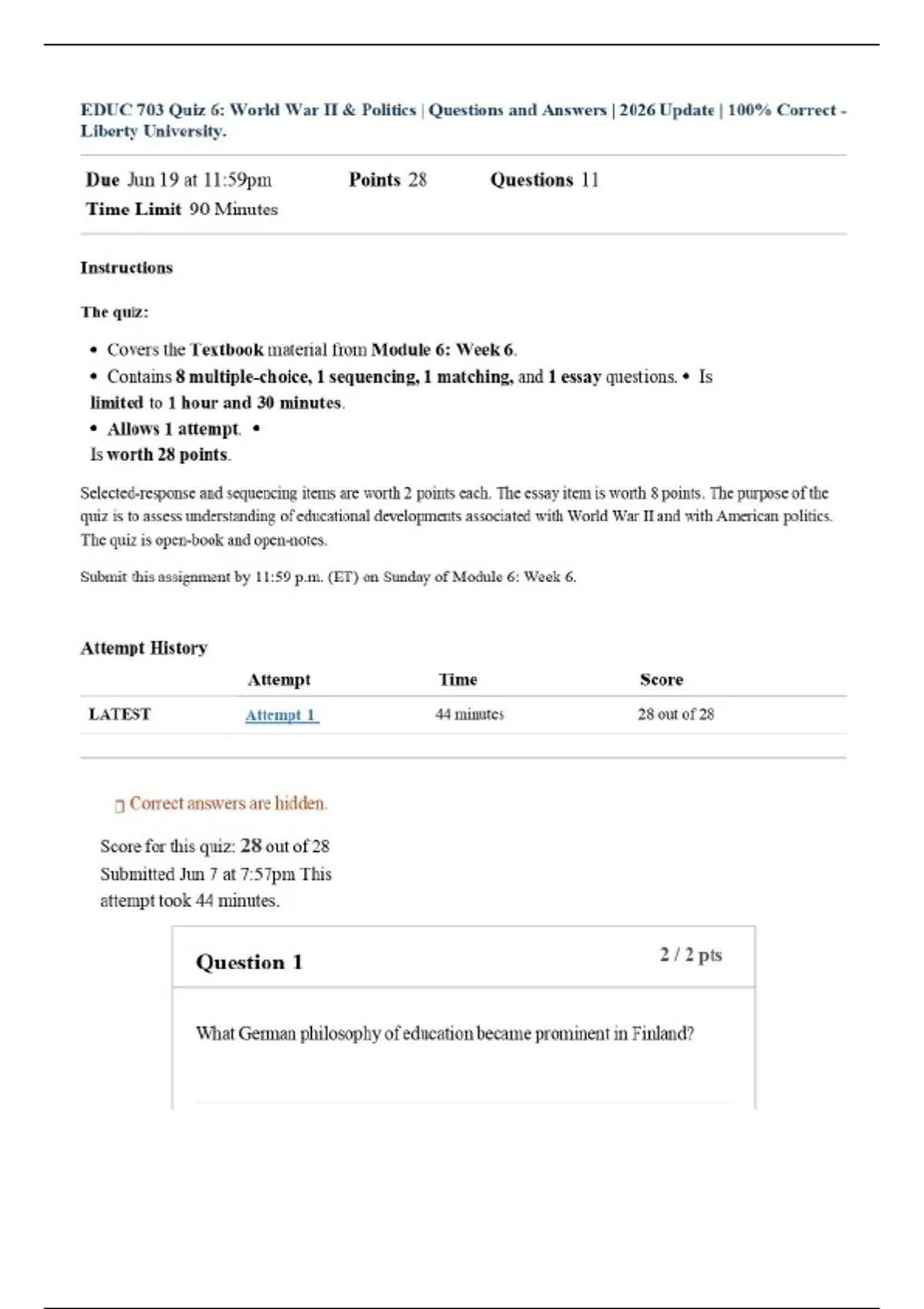 EDUC 703 Quiz 6: World War II & Politics | Questions and Answers | 2026 Update | 100% Correct - Liberty University.