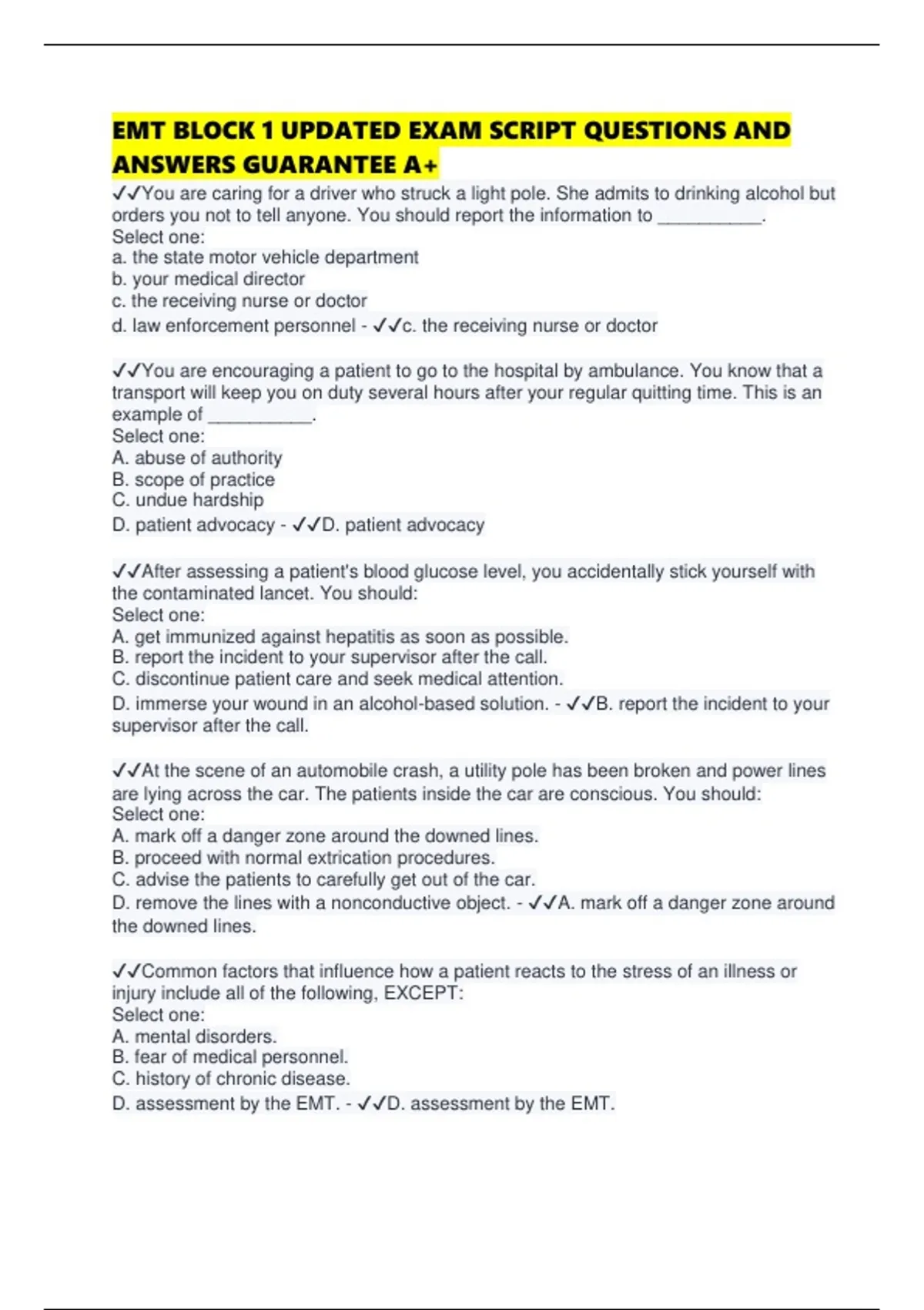EMT BLOCK 1 UPDATED EXAM SCRIPT QUESTIONS AND