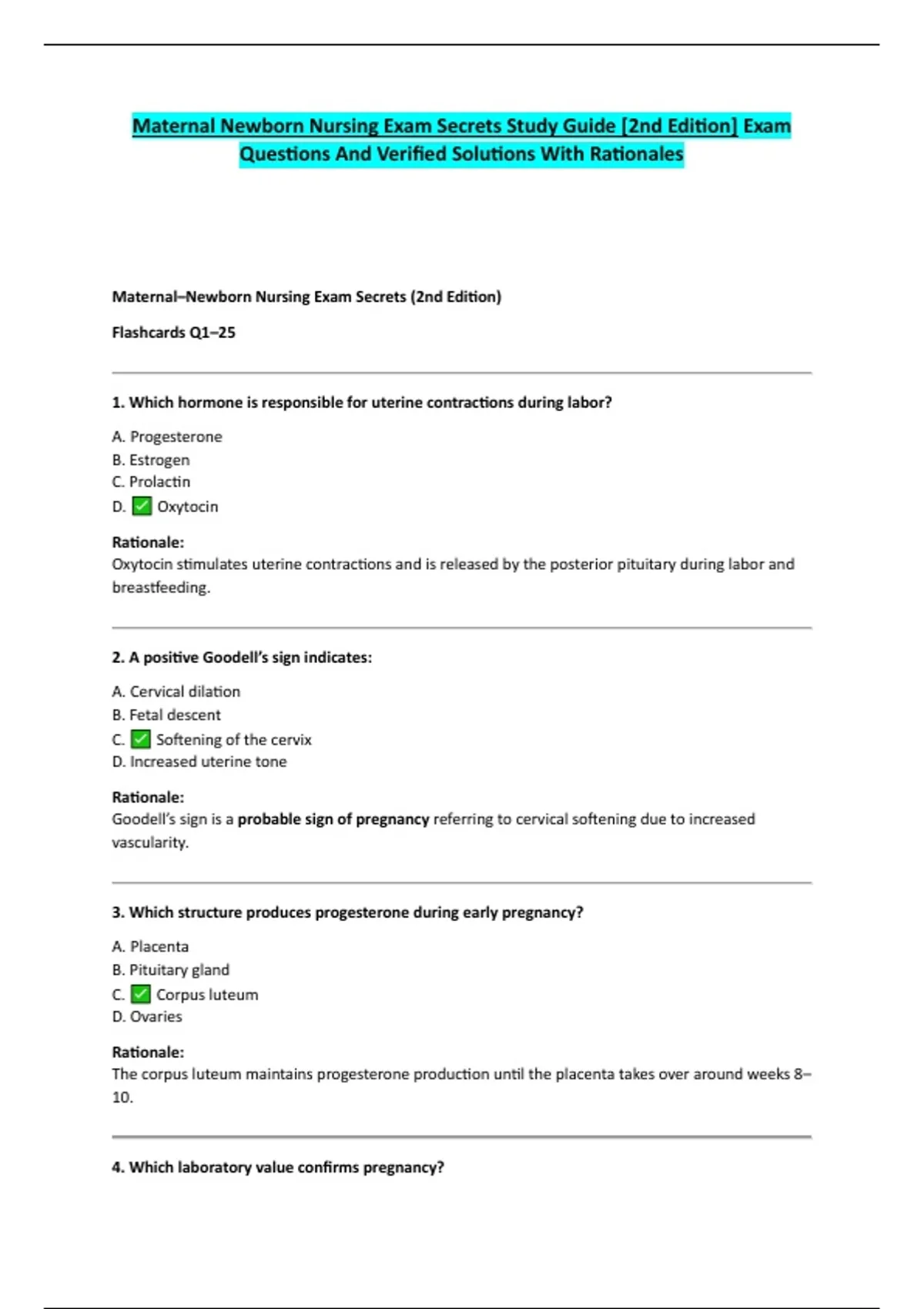 Maternal Newborn Nursing Exam Secrets Study Guide -2nd Edition-.Exam Questions And Verified Solutions And Rationales.