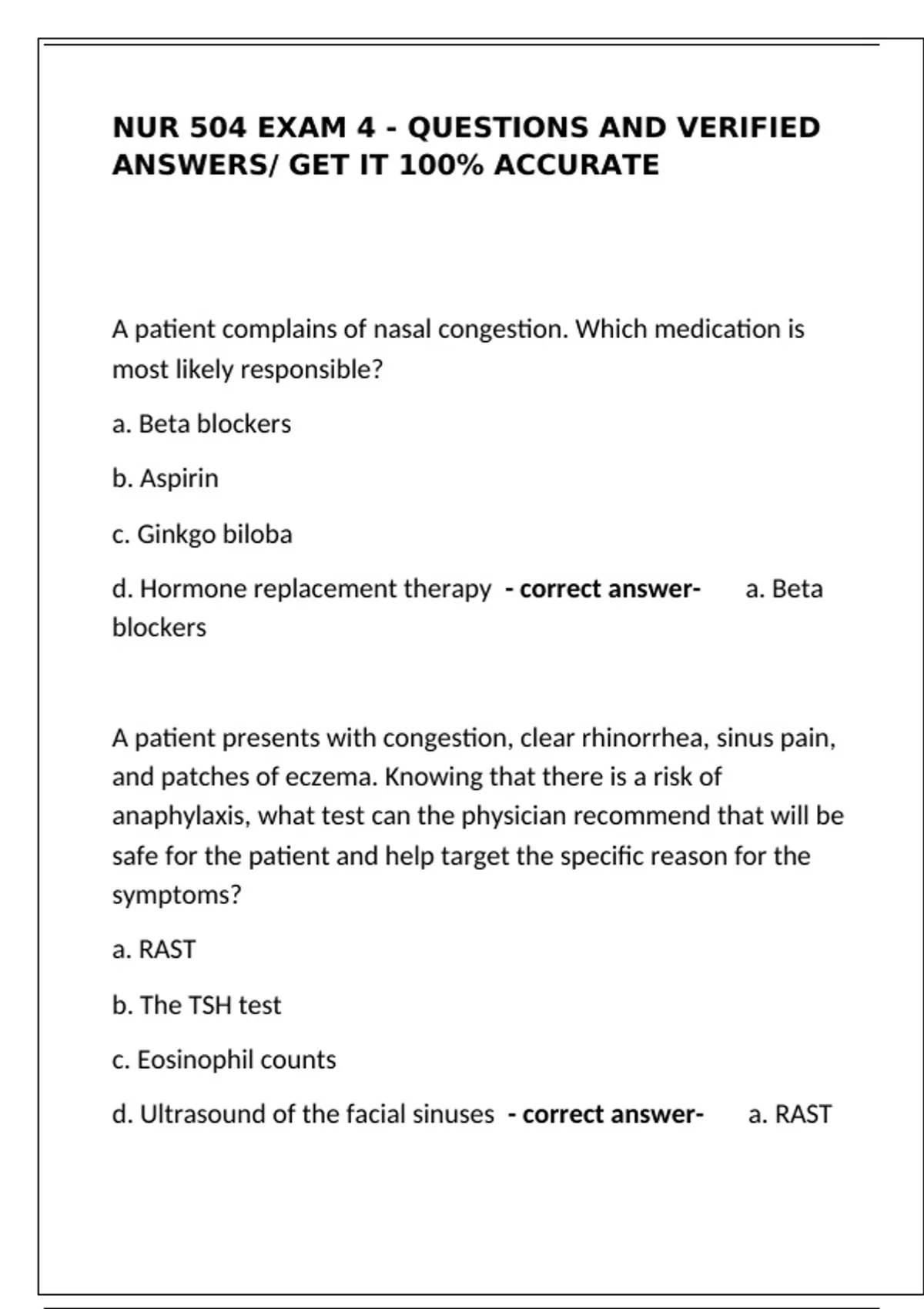 NUR 504 EXAM 4 - QUESTIONS AND VERIFIED