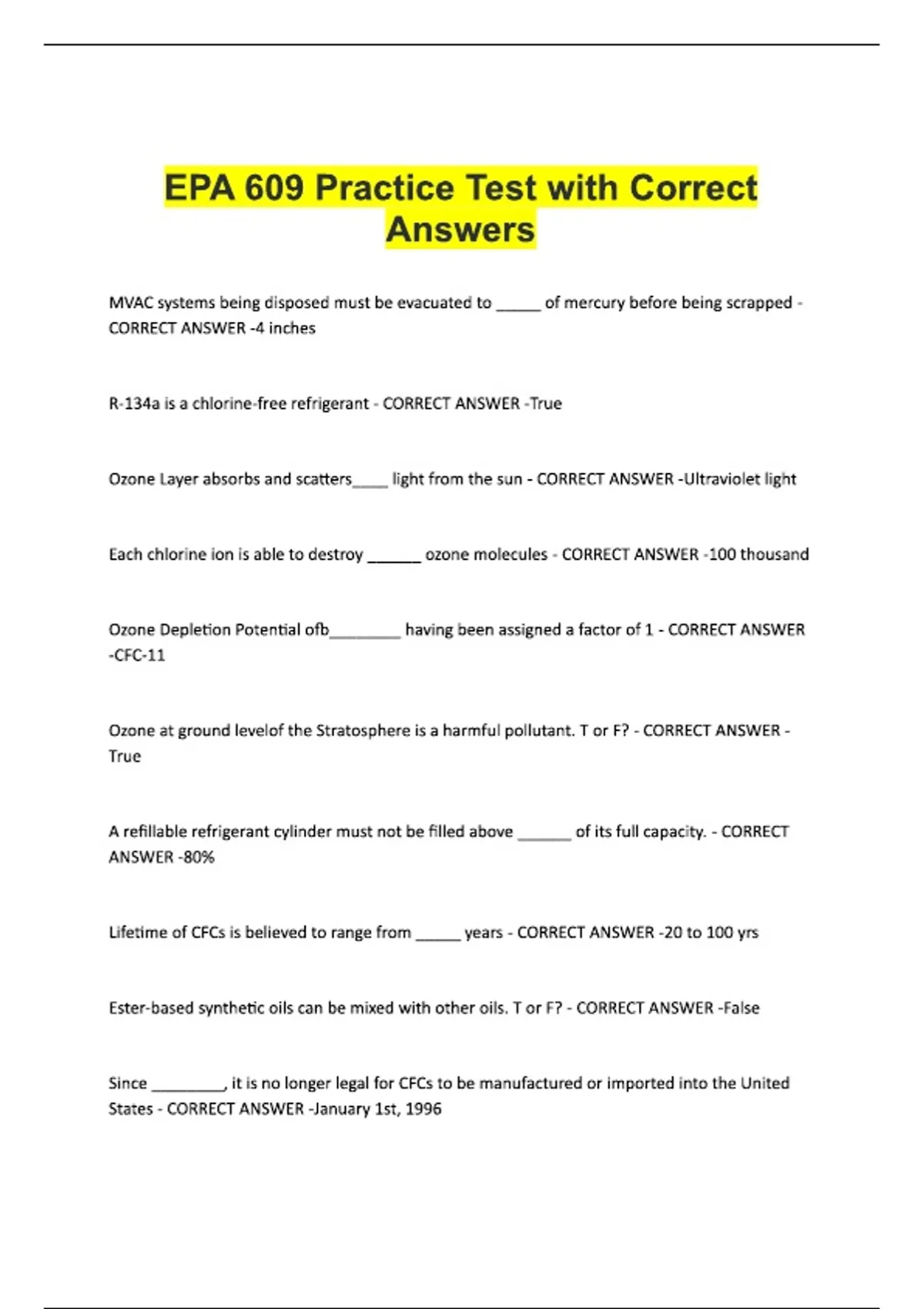 EPA 609 Practice Test with Correct Answers.