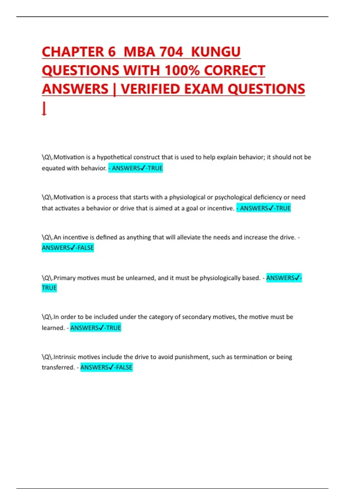 CHAPTER 6 MBA 704 KUNGU QUESTIONS WITH 100% CORRECT ANSWERS | VERIFIED EXAM QUESTIONS | Q.Motivation is a hypothetical construct that is used to help explain behavior; it should not be equated with behavior. - ANSWERS-TRUE Q.Motivation is a process that starts with a physiological or psychological deficiency or need that activates a behavior or drive that is aimed at a goal or incentive. - ANSWERS-TRUE Q.An incentive is defined as anything that will alleviate the needs and increase the drive. - ANSWERS-FALSE Q.Primary motives must be unlearned, and it must be physiologically based. - ANSWERS-TRUE Q.In order to be included under the category of secondary motives, the motive must be learned. - ANSWERS-TRUE Q.Intrinsic motives include the drive to avoid punishment, such as termination or being transferred. - ANSWERS-FALSE Q.According to Maslow, one of the needs identified is the love need, however there are instances where there are misleading connotations, such as sex, which is essentially a physiological need. - ANSWERS-TRUE Q.Maslow did not point out that the esteem needs consist of both self-esteem and esteem from others. He mainly conceded the importance of esteem of others. - ANSWERS-FALSE Q.Maslow's needs hierarchy theory does make a significant contribution in terms of making management aware of the diverse needs of employees at work. - ANSWERS-TRUE Q.Tabulating the results from the critical incident method, Herzberg concluded that job satisfiers are related to job context and that job dissatisfiers are allied to job content. - ANSWERS-FALSE Q.The term hygiene, in Herzberg's theory, refers to those factors that prevent dissatisfaction. - ANSWERS-TRUE Q.The fact that there are a higher number of employees who are dissatisfied with the raise they get points out that the hygiene factors seem to be important in preventing dissatisfaction but do not lead to satisfaction. - ANSWERS-TRUE Q.According to the Porter-Lawler model, the inference is that employees need to better focus their efforts on high-impact behaviors and activities that result in higher performance. - ANSWERS-TRUE Q.The roots of Porter-Lawler expectancy theory of work motivation can be traced back to cognitive dissonance theory and exchange theory. - ANSWERS-FALSE Q.Inequity occurs when a person perceives that the ratio of his or her outcomes to other's outcomes and the ratio of a relevant other's input to his or her inputs are unequal. - ANSWERS-FALSE Q.Equity theory supports a perception of distributive justice, which is an individual's cognitive evaluation regarding whether or not the amounts and allocations of rewards in a social setting are fair. - ANSWERS-TRUE Q.Interactional justice is the exchange between the employee and the employing organization. - ANSWERS-FALSE Q.Attribution theory is concerned with the relationship between personal social perception and interpersonal behavior. - ANSWERS-TRUE Q.Harold Kelly stressed that attribution theory is concerned with the intuitive processes by which an individual interprets behavior as being attributed to certain parts of the relevant environment. - ANSWERS-FALSE Q.Employees who perceive external control feel that they personally can influence their outcomes through their own ability, skills or effort. - ANSWERS-FALSE Q.Attributions are related to organizational symbolism, which in effect says that in order to understand organizations, one must recognize their symbolic nature. - ANSWERS-TRUE Q.According to the dimensions that Kelley suggests, if there is a high consensus, high consistency, and high distinctiveness, then attribution to external or situational/environmental causes will probably be made. - ANSWERS-FALSE