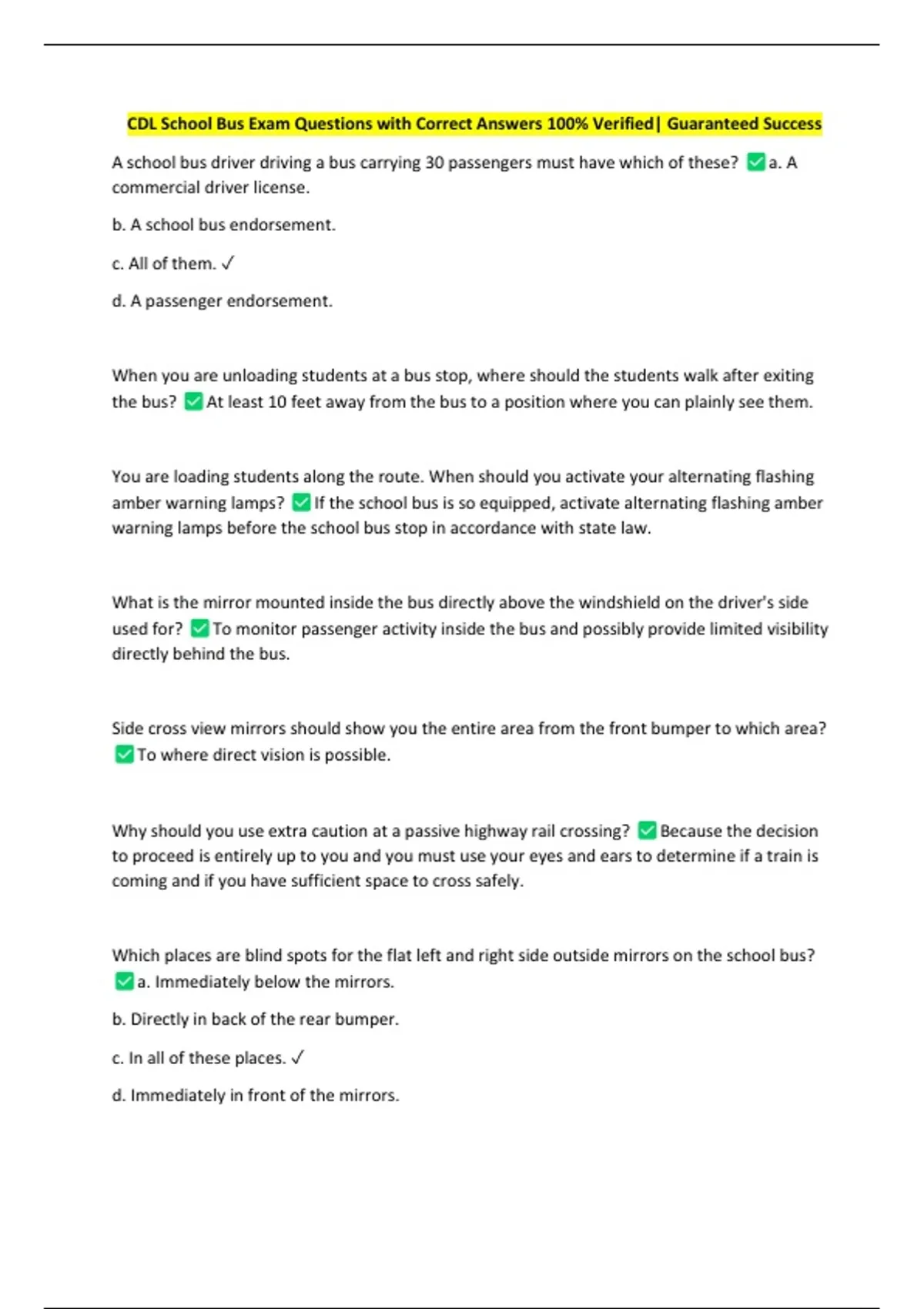 CDL School Bus Exam Questions with Correct Answers 100% Verified| Guaranteed Success