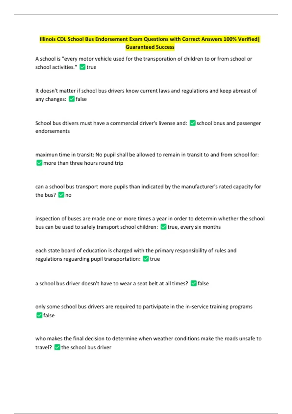 Illinois CDL School Bus Endorsement Exam Questions with Correct Answers 100% Verified|