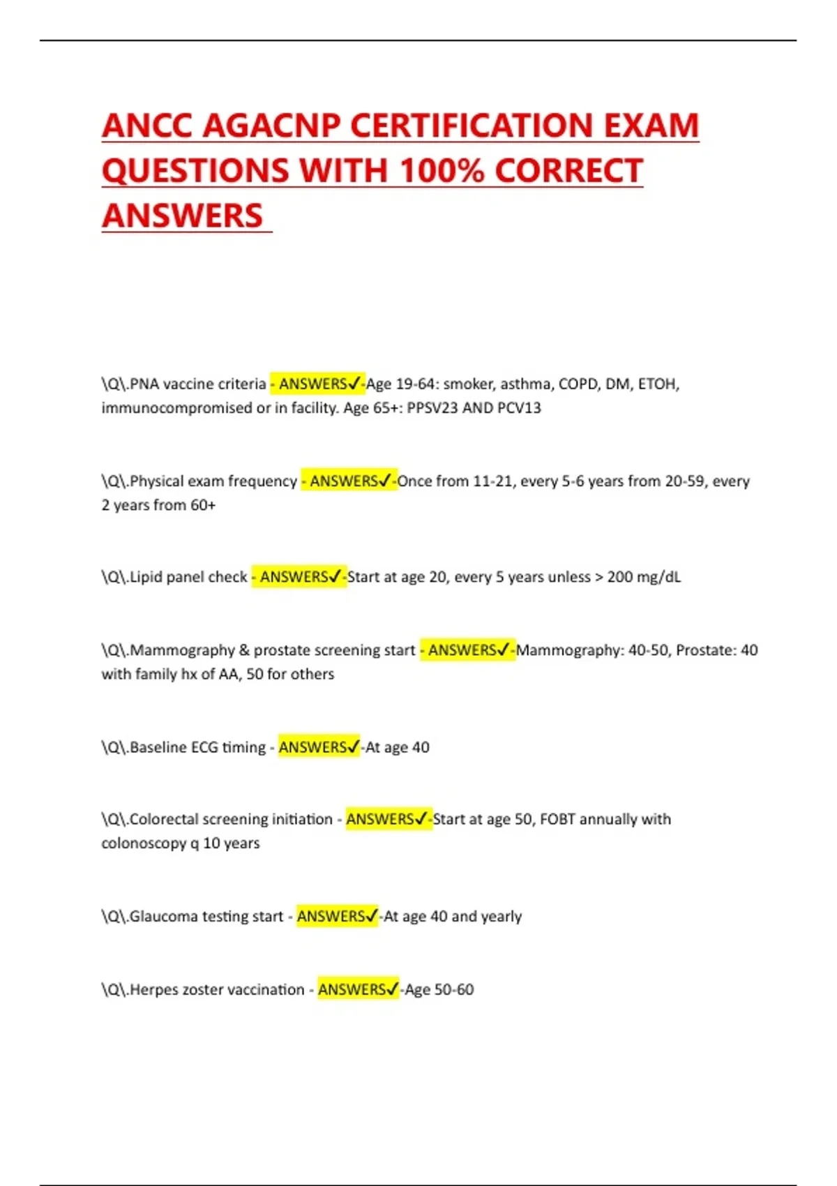 ANCC AGACNP CERTIFICATION EXAM QUESTIONS WITH 100% CORRECT ANSWERS | VERIFIED EXAM QUESTIONS | Q.PNA vaccine criteria - ANSWERS-Age 19-64: smoker, asthma, COPD, DM, ETOH, immunocompromised or in facility. Age 65+: PPSV23 AND PCV13 Q.Physical exam frequency - ANSWERS-Once from 11-21, every 5-6 years from 20-59, every 2 years from 60+ Q.Lipid panel check - ANSWERS-Start at age 20, every 5 years unless 200 mg/dL Q.Mammography & prostate screening start - ANSWERS-Mammography: 40-50, Prostate: 40 with family hx of AA, 50 for others Q.Baseline ECG timing - ANSWERS-At age 40 Q.Colorectal screening initiation - ANSWERS-Start at age 50, FOBT annually with colonoscopy q 10 years Q.Glaucoma testing start - ANSWERS-At age 40 and yearly Q.Herpes zoster vaccination - ANSWERS-Age 50-60 Q.Pap smear cessation criteria - ANSWERS-Age 65-70 with 3 normal tests, no abnormal tests in 10 years Q.Top 4 US killers - ANSWERS-Heart disease, colorectal cancer, Lower respiratory disease, CVA stroke Q.Most fatal cancer in men & women - ANSWERS-Lung cancer Q.Most common cancer in US women - ANSWERS-Breast cancer Q.Most common cancer in US men - ANSWERS-Prostate cancer Q.Hep A vaccine recipients - ANSWERS-Military, travelers, MSM Q.Hep B vaccine recipients - ANSWERS-Healthcare workers, high-risk patients Q.Ginger usage & risk - ANSWERS-Nausea relief, INCREASED BLEEDING risk Q.Ginseng usage & risk - ANSWERS-Well-being enhancement, INCREASED BLEEDING risk, mania with MAOIs Q.St. John's wort usage & risk - ANSWERS-Depression aid, INCREASED CLOTTING risk, drug interactions Q.Echinacea usage & risk - ANSWERS-Cold remedy, Anaphylaxis risk, hepatotoxicity Q.Gingko Biloba usage & risk - ANSWERS-Memory aid, INCREASED BLEEDING risk, increased BP Q.Black cohosh usage & risk - ANSWERS-Menopause relief, INCREASED BLEEDING risk, seizures with high doses Q.Evening primrose usage & risk - ANSWERS-Menopause relief, blood glucose elevation, seizure risk Q.Kava kava usage & risk - ANSWERS-Relaxation aid, HTN risk with high doses, liver damage Q.Garlic usage & risk - ANSWERS-Indigestion relief, INCREASED BLEEDING risk Q.HIPAA titles - ANSWERS-Title 1: health insurance coverage for workers. Title 2: national standards for healthcare transactions Q.HIPAA compliance - ANSWERS-Healthcare providers, clearinghouses, health plans Q.Healthy People 2020 goals - ANSWERS-Increase quality & years of healthy life, eliminate health disparities Q.Reportable diagnoses to Health Dept - ANSWERS-Gonorrhea, Chlamydia, Syphilis, HIV, TB, Animal bites Q.Medicare A coverage - ANSWERS-Hospital, SNF, home care, hospice