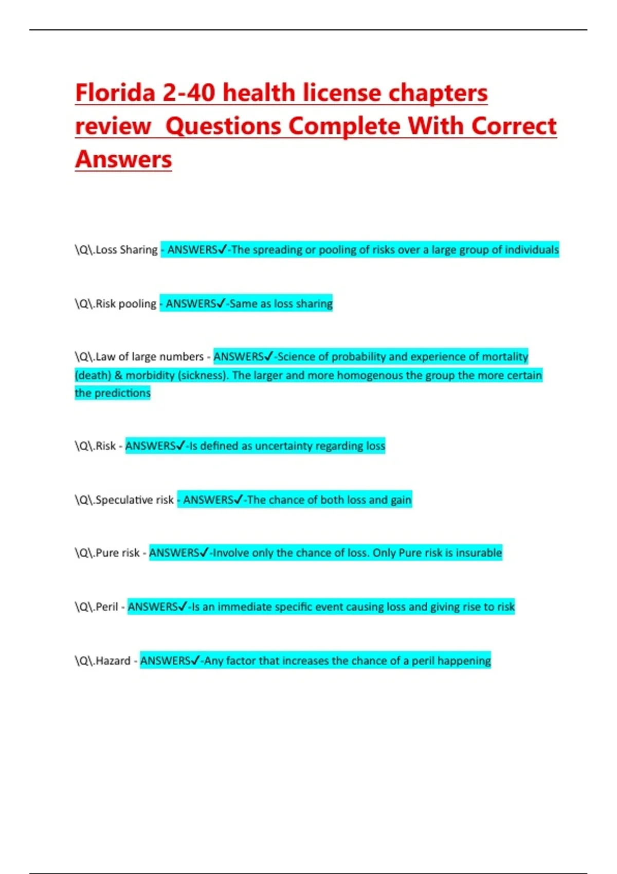 Florida 2-40 health license chapters review Questions Complete With Correct Answers Q.Loss Sharing - ANSWERS-The spreading or pooling of risks over a large group of individuals Q.Risk pooling - ANSWERS-Same as loss sharing Q.Law of large numbers - ANSWERS-Science of probability and experience of mortality (death) & morbidity (sickness). The larger and more homogenous the group the more certain the predictions Q.Risk - ANSWERS-Is defined as uncertainty regarding loss Q.Speculative risk - ANSWERS-The chance of both loss and gain Q.Pure risk - ANSWERS-Involve only the chance of loss. Only Pure risk is insurable Q.Peril - ANSWERS-Is an immediate specific event causing loss and giving rise to risk Q.Hazard - ANSWERS-Any factor that increases the chance of a peril happening Q.Physical hazards - ANSWERS-Individual characteristics that increase chance of ness and deafness as well as racing a motorcycle around on a track are all physical hazards Q.Moral hazards - ANSWERS-Bad behavioral choices like alcoholism drug addiction. These are moral hazards that increase risk and loss Q.Morale hazards - ANSWERS-Attitude or state of mind causing indifference to loss. Example driving recklessly intentionally ie selfishness Q.Risk avoidance - ANSWERS-You NEVER EVER do that. Example fly drive invest in stocks Q.Risk reduction - ANSWERS-Lessen possibility of loss by being cautious and taking action to reduce risk example installing fire alarm Q.Risk Retention - ANSWERS-You did not purchase insurance and plan to cover loss on your own called self- insuring Q.Risk Transference - ANSWERS-Transferring your risk to an insurer (insurance company) Q.Elements of Insurance risk - ANSWERS-Definate and measurable 2. Predictable t be catastrophic to insurance company exposure to insured must be large 5. Loss exposures must be randomly selected Q.Human life value - ANSWERS-Value today of an individual's future earnings that are devoted to that individuals dependents