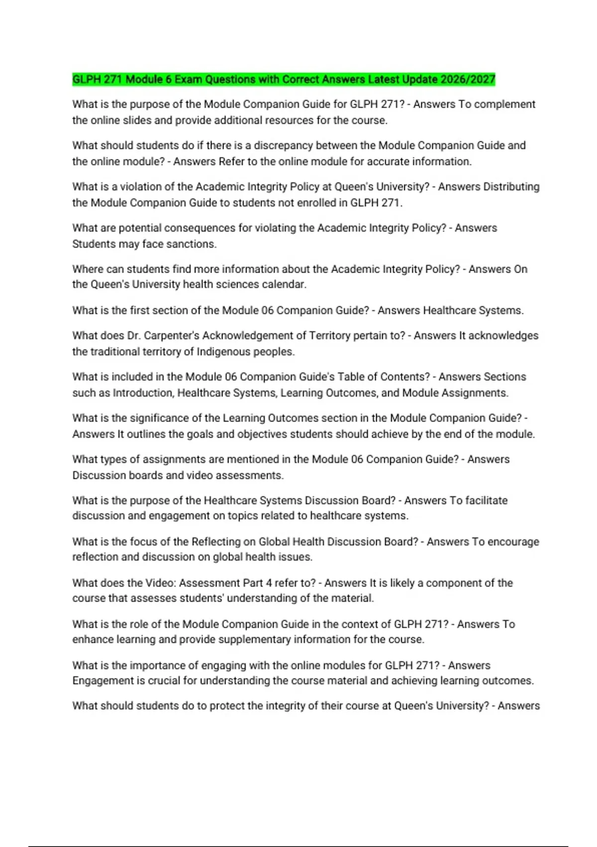 GLPH 271 Module 6 Exam Questions with Correct Answers Latest Update 2026/2027 What is the purpose of the Module Companion Guide for GLPH 271? - Answers To complement the online slides and provide additional resources for the course. What should students do if there is a discrepancy between the Module Companion Guide and the online module? - Answers Refer to the online module for accurate information. What is a violation of the Academic Integrity Policy at Queen's University? - Answers Distributing the Module Companion Guide to students not enrolled in GLPH 271. What are potential consequences for violating the Academic Integrity Policy? - Answers Students may face sanctions. Where can students find more information about the Academic Integrity Policy? - Answers On the Queen's University health sciences calendar. What is the first section of the Module 06 Companion Guide? - Answers Healthcare Systems. What does Dr. Carpenter's Acknowledgement of Territory pertain to? - Answers It acknowledges the traditional territory of Indigenous peoples. What is included in the Module 06 Companion Guide's Table of Contents? - Answers Sections such as Introduction, Healthcare Systems, Learning Outcomes, and Module Assignments. What is the significance of the Learning Outcomes section in the Module Companion Guide? - Answers It outlines the goals and objectives students should achieve by the end of the module. What types of assignments are mentioned in the Module 06 Companion Guide? - Answers Discussion boards and video assessments. What is the purpose of the Healthcare Systems Discussion Board? - Answers To facilitate discussion and engagement on topics related to healthcare systems. What is the focus of the Reflecting on Global Health Discussion Board? - Answers To encourage reflection and discussion on global health issues. What does the Video: Assessment Part 4 refer to? - Answers It is likely a component of the course that assesses students' understanding of the material. What is the role of the Module Companion Guide in the context of GLPH 271? - Answers To enhance learning and provide supplementary information for the course. What is the importance of engaging with the online modules for GLPH 271? - Answers Engagement is crucial for understanding the course material and achieving learning outcomes. What should students do to protect the integrity of their course at Queen's University? - Answers Avoid sharing course materials with unauthorized individuals. What is the expected outcome of participating in the course assignments? - Answers To deepen understanding of healthcare systems and global health. What is the significance of the Module 06 introduction section? - Answers It provides an overview and context for the topics covered in the module. What is Universal Health Coverage (UHC)? - Answers UHC ensures that all individuals have access to necessary health services without financial hardship. What are the key components of Universal Health Coverage? - Answers Access to healthcare services, quality of care, and financial protection. What is the significance of evaluating the global prevalence of UHC? - Answers It helps identify gaps in health coverage and informs policy decisions for improvement. What are common funding sources for health coverage? - Answers Government funding, private insurance, out-of-pocket payments, and international aid. What are the different healthcare models? - Answers Models include Beveridge, Bismarck, National Health Insurance, and out-of-pocket. How does access impact the quality of health services? - Answers Limited access can lead to