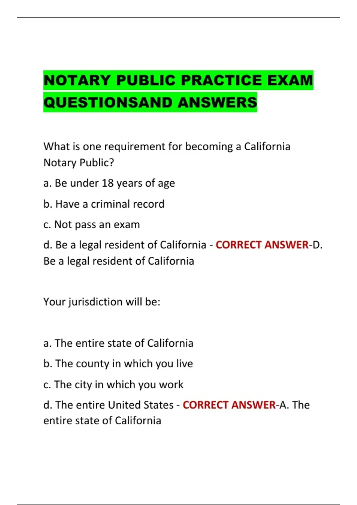 NOTARY PUBLIC PRACTICE EXAM QUESTIONSAND ANSWERS