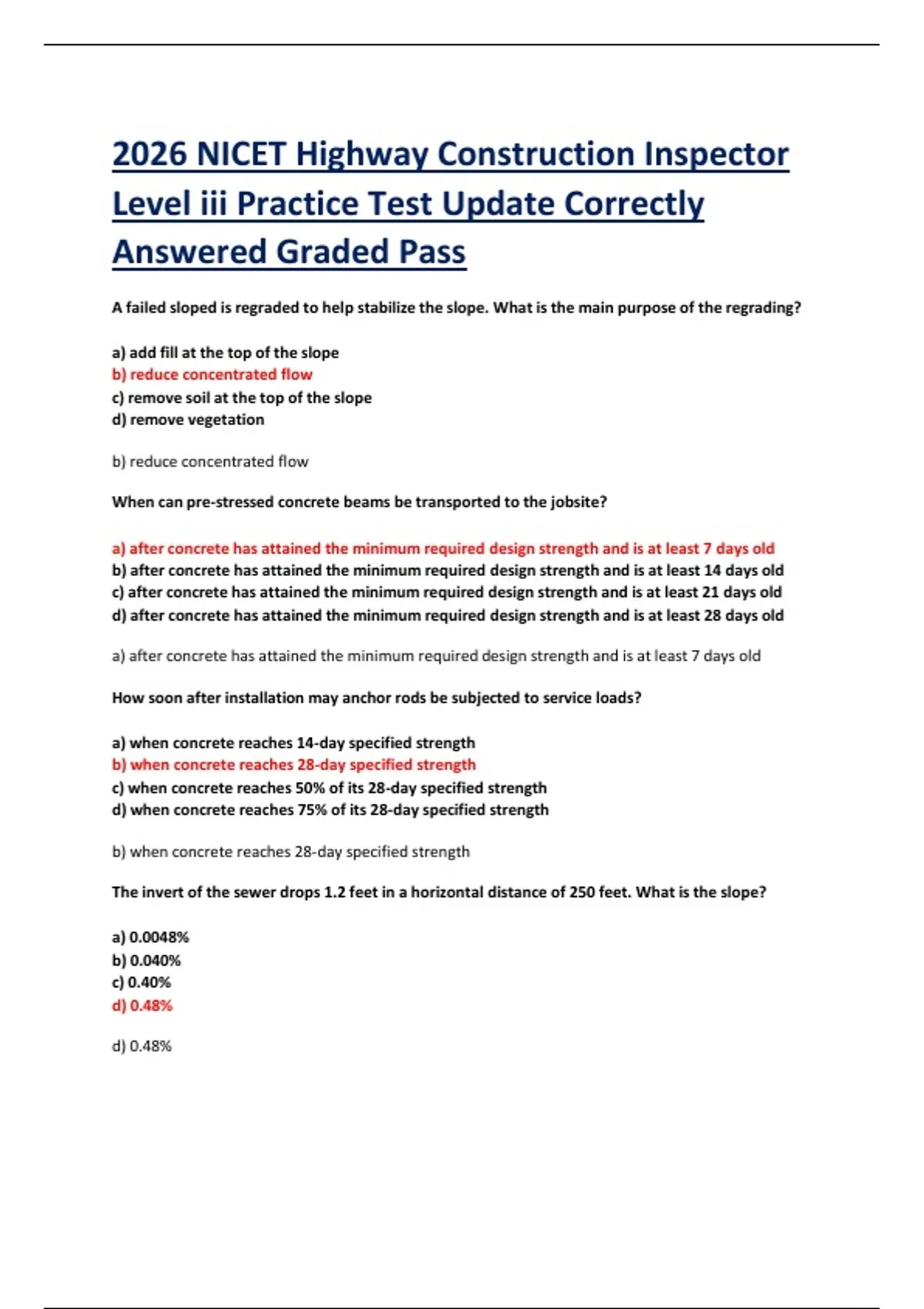 2026 NICET Highway Construction Inspector Level iii Practice Test Update Correctly Answered Graded Pass