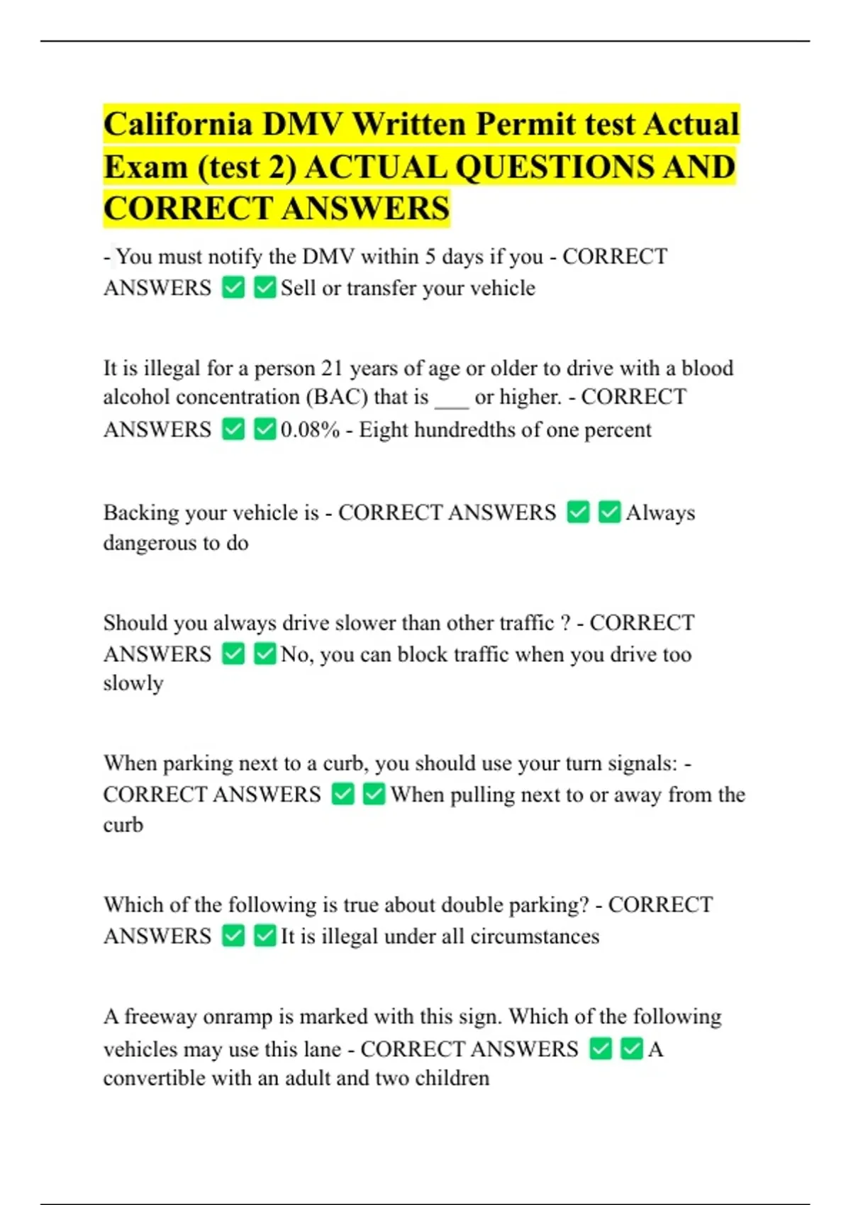 California DMV Written Permit test Actual Exam (test 2) ACTUAL QUESTIONS AND CORRECT ANSWERS - You must notify the DMV within 5 days if you - CORRECT ANSWERS Sell or transfer your vehicle