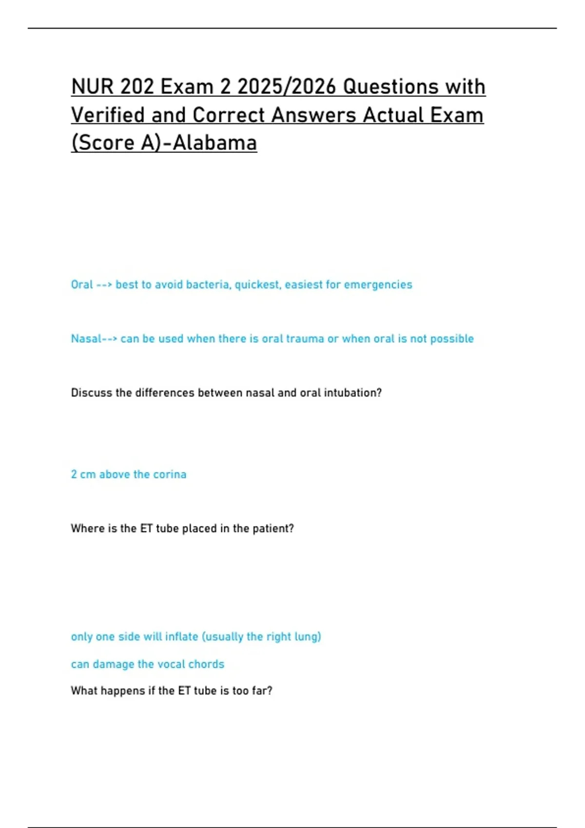 NUR 202 Exam 2 2025/2026 Questions with Verified and Correct Answers Actual Exam (Score A)-Alabama