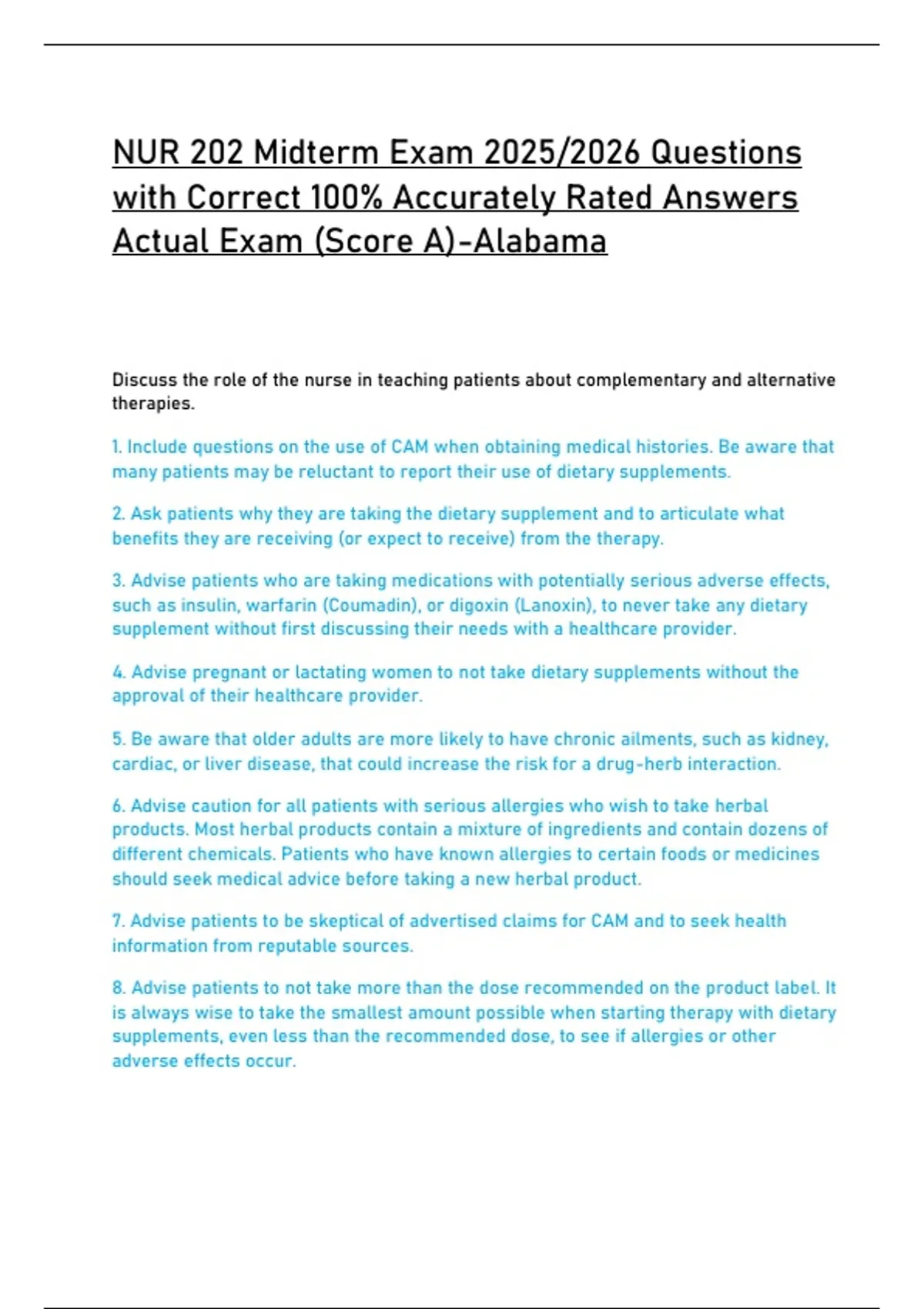 NUR 202 Midterm Exam 2025/2026 Questions with Correct 100% Accurately Rated Answers Actual Exam (Score A)-Alabama Discuss the role of the nurse in teaching patients about complementary and alternative therapies. 1. Include questions on the use of CAM when obtaining medical histories. Be aware that many patients may be reluctant to report their use of dietary supplements. 2. Ask patients why they are taking the dietary supplement and to articulate what benefits they are receiving (or expect to receive) from the therapy. 3. Advise patients who are taking medications with potentially serious adverse effects, such as insulin, warfarin (Coumadin), or digoxin (Lanoxin), to never take any dietary supplement without first discussing their needs with a healthcare provider. 4. Advise pregnant or lactating women to not take dietary supplements without the approval of their healthcare provider. 5. Be aware that older adults are more likely to have chronic ailments, such as kidney, cardiac, or liver disease, that could increase the risk for a drug-herb interaction. 6. Advise caution for all patients with serious allergies who wish to take herbal products. Most herbal products contain a mixture of ingredients and contain dozens of different chemicals. Patients who have known allergies to certain foods or medicines should seek medical advice before taking a new herbal product. 7. Advise patients to be skeptical of advertised claims for CAM and to seek health information from reputable sources. 8. Advise patients to not take more than the dose recommended on the product label. It is always wise to take the smallest amount possible when starting therapy with dietary supplements, even less than the recommended dose, to see if allergies or other adverse effects occur.