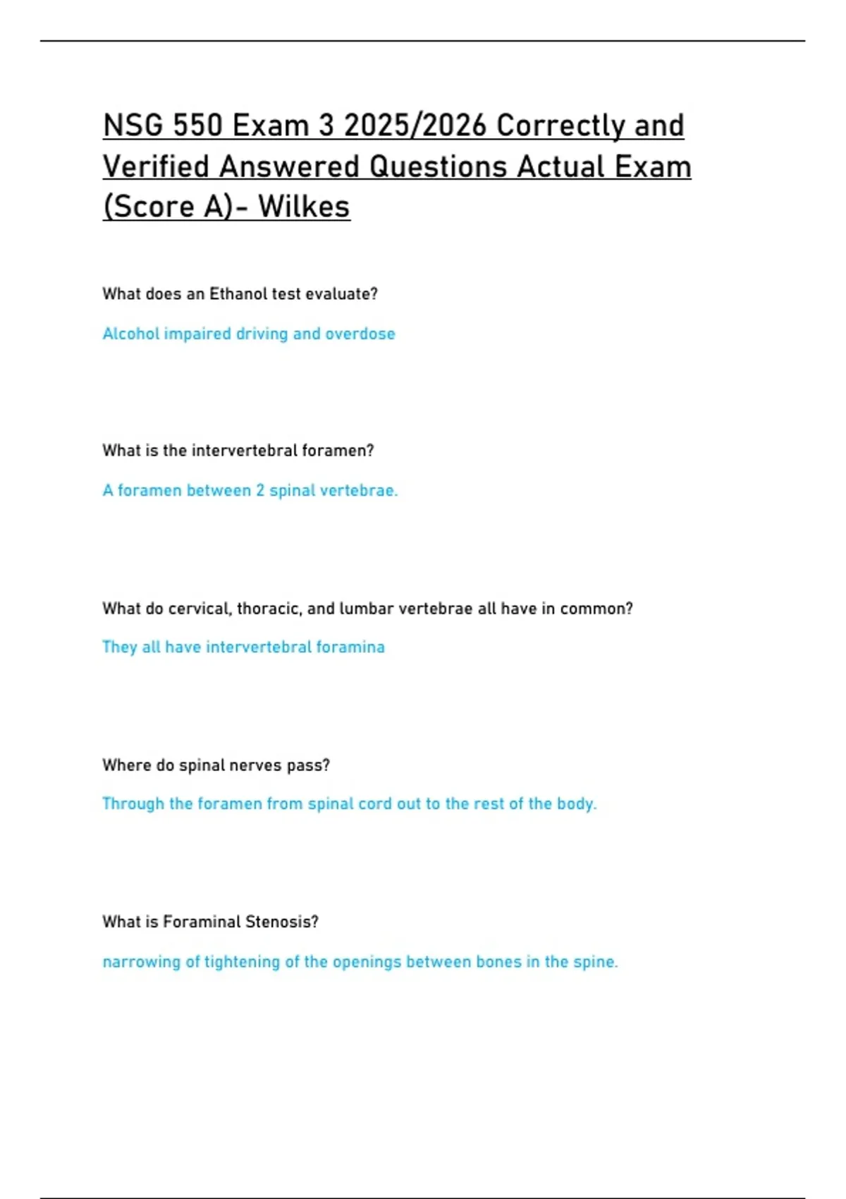 NSG 550 Exam 3 2025What does an Ethanol test evaluate? Alcohol impaired driving and overdose What is the intervertebral foramen? A foramen between 2 spinal vertebrae. What do cervical, thoracic, and lumbar vertebrae all have in common? They all have intervertebral foramina/2026 Correctly and Verified Answered Questions Actual Exam (Score A)- Wilkes