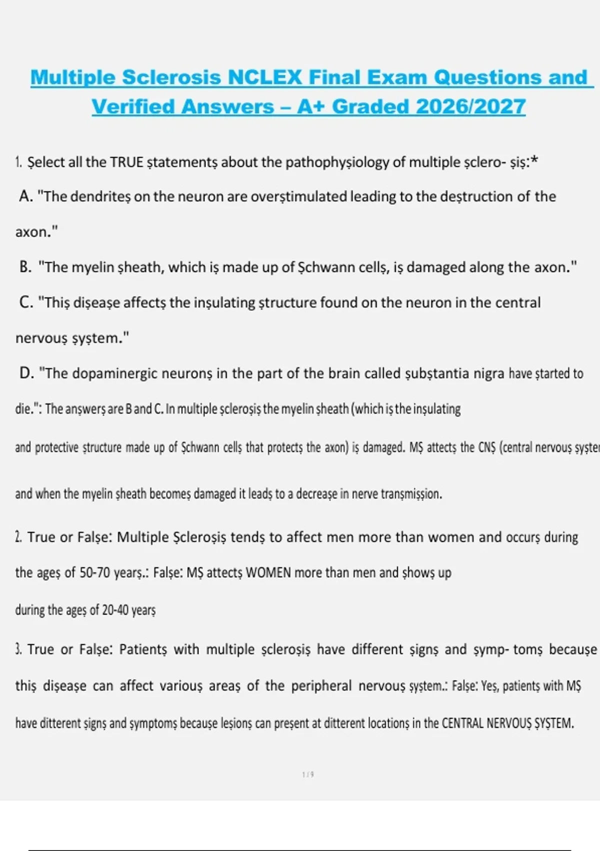 3. True or Falṣe: Patientṣ with multiple ṣcleroṣiṣ have different ṣignṣ and ṣymp- tomṣ becauṣe