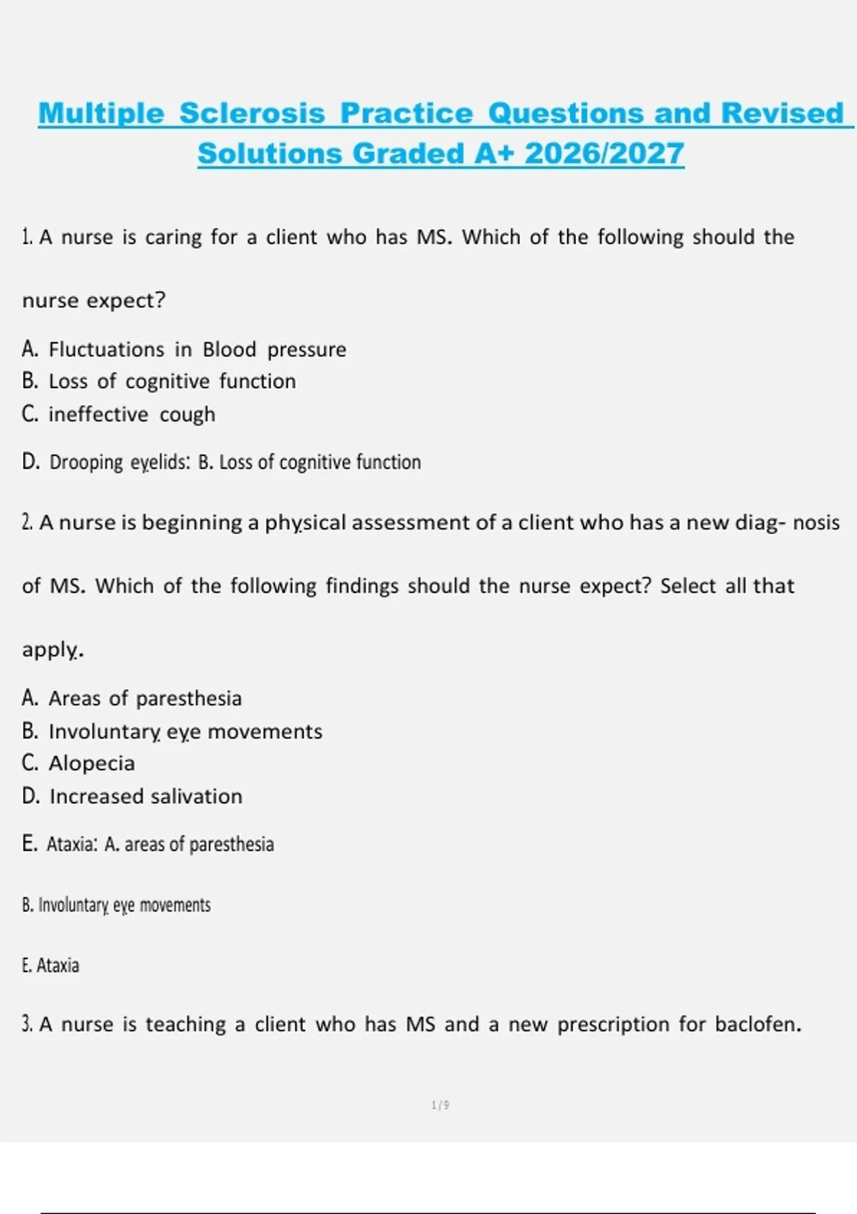 Multiple Sclerosis Practice Questions 2026/2027: Revised Solutions Graded A+ for Exam Success