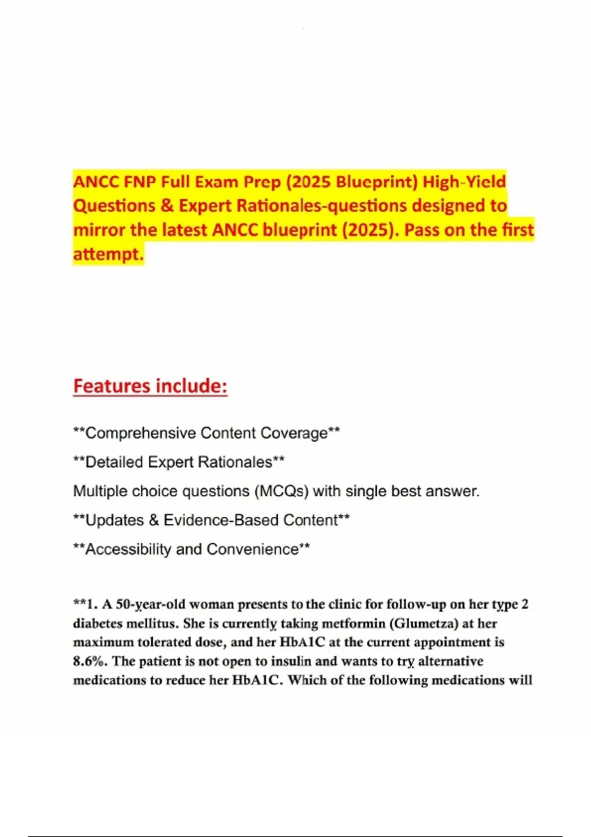 ANCC FNP Full Exam 1 Prep (2025 Blueprint) High Yield Questions & Expert Rationales-questions designed to mirror the latest ANCC blueprint (2025). Pass on the first attempt.Ace your ANCC Family Nurse Practitioner (FNP) Exam with this comprehensive full exam prep resource, designed to mirror the latest 2025 ANCC blueprint. This set includes high‑yield multiple‑choice questions (MCQs) with single best answers, detailed rationales, and evidence‑based updates to ensure you’re prepared to pass on the first attempt. Features: - Comprehensive Content Coverage across all major ANCC FNP domains - Detailed Expert Rationales explaining correct and incorrect answers - High‑Yield, Exam‑Style Questions that replicate the real testing experience - Evidence‑Based Updates (2025) aligned with the latest ANCC blueprint - Convenient & Accessible Format for flexible study anytime, anywhere This exam prep is ideal for FNP candidates who want a structured, exam‑ready resource that maximizes study efficiency and builds confidence