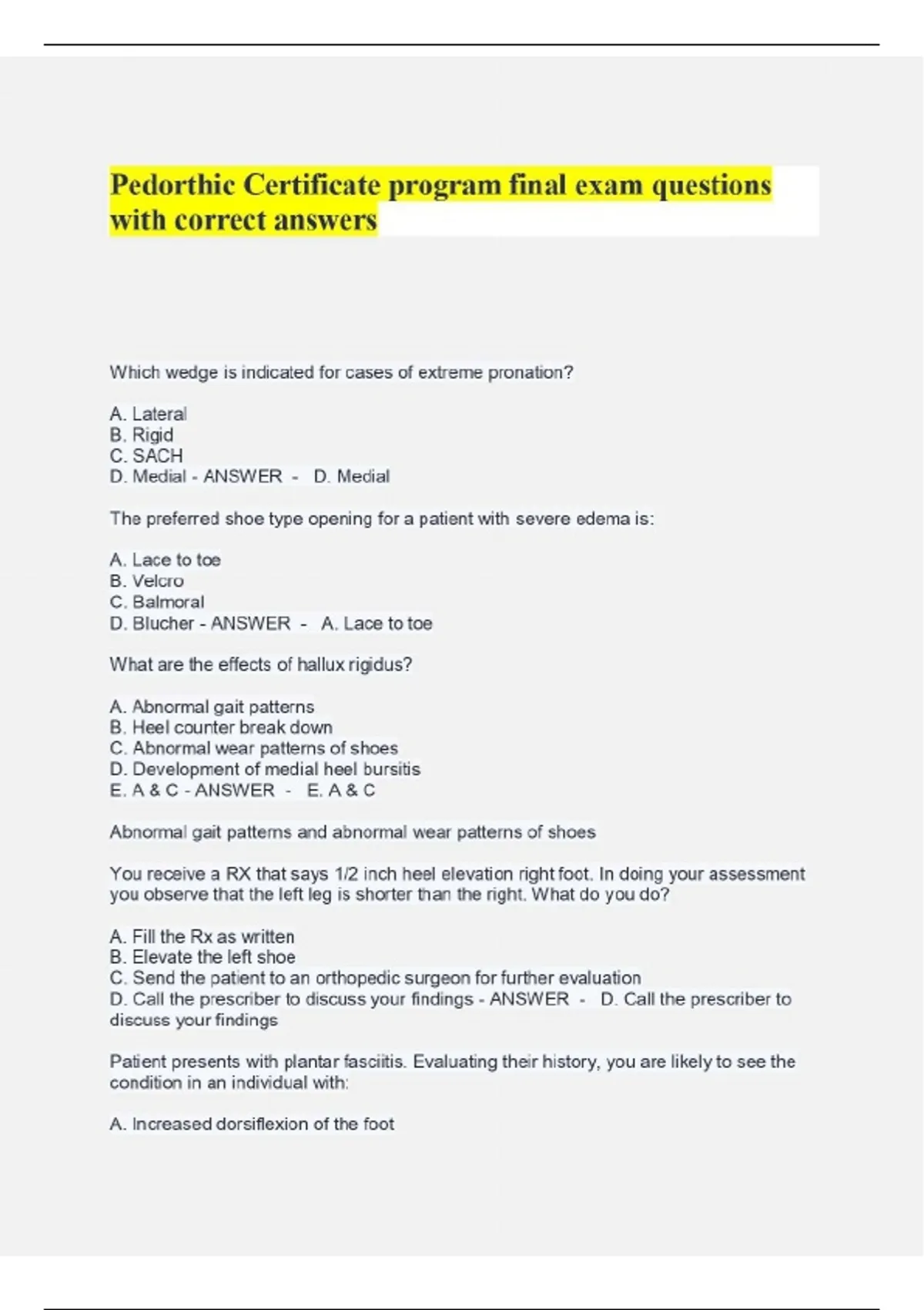 Pedorthic Certificate program final exam questions with correct answers UPDATED!!!