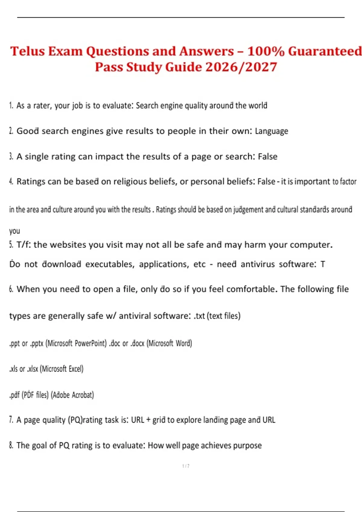 This study guide includes TELUS exam questions with accurate, exam-aligned answers to support effective preparation. It focuses on key concepts, rating guidelines, and practical scenarios commonly tested, helping candidates build confidence for the 2026/2027 exam cycle.