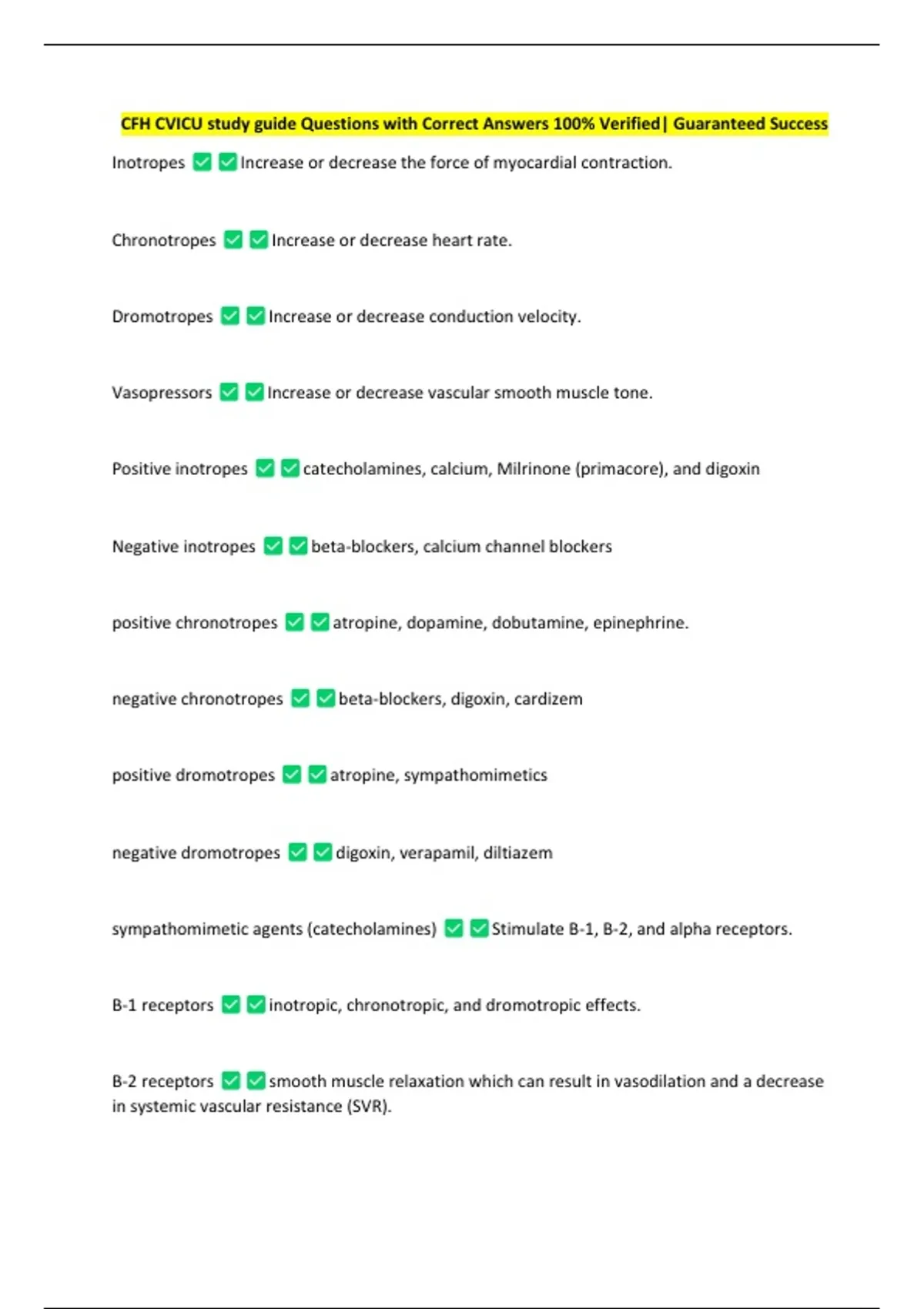 CFH CVICU study guide Questions with Correct Answers 100% Verified| Guaranteed Success