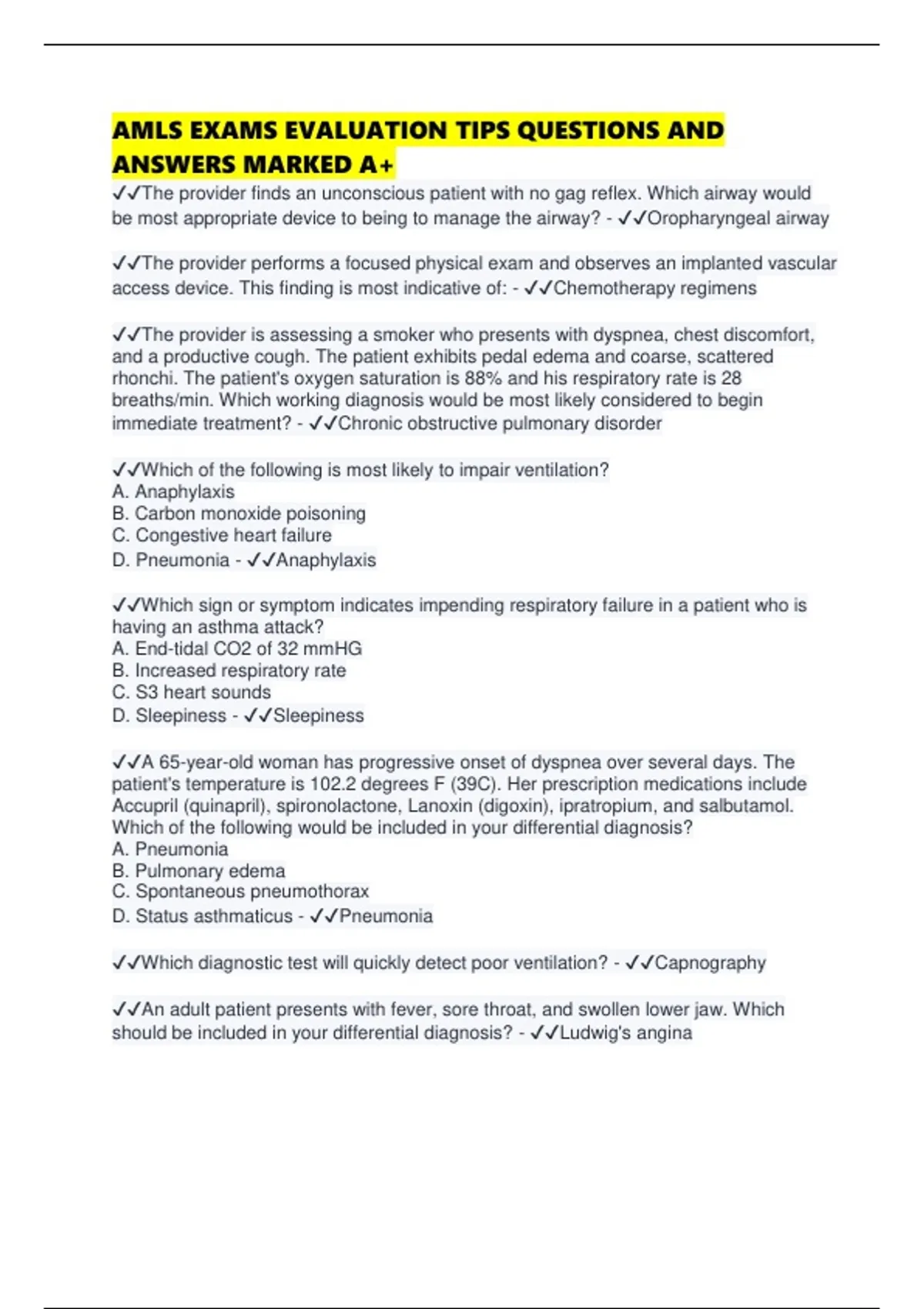 AMLS EXAMS EVALUATION TIPS QUESTIONS AND ANSWERS MARKED A+