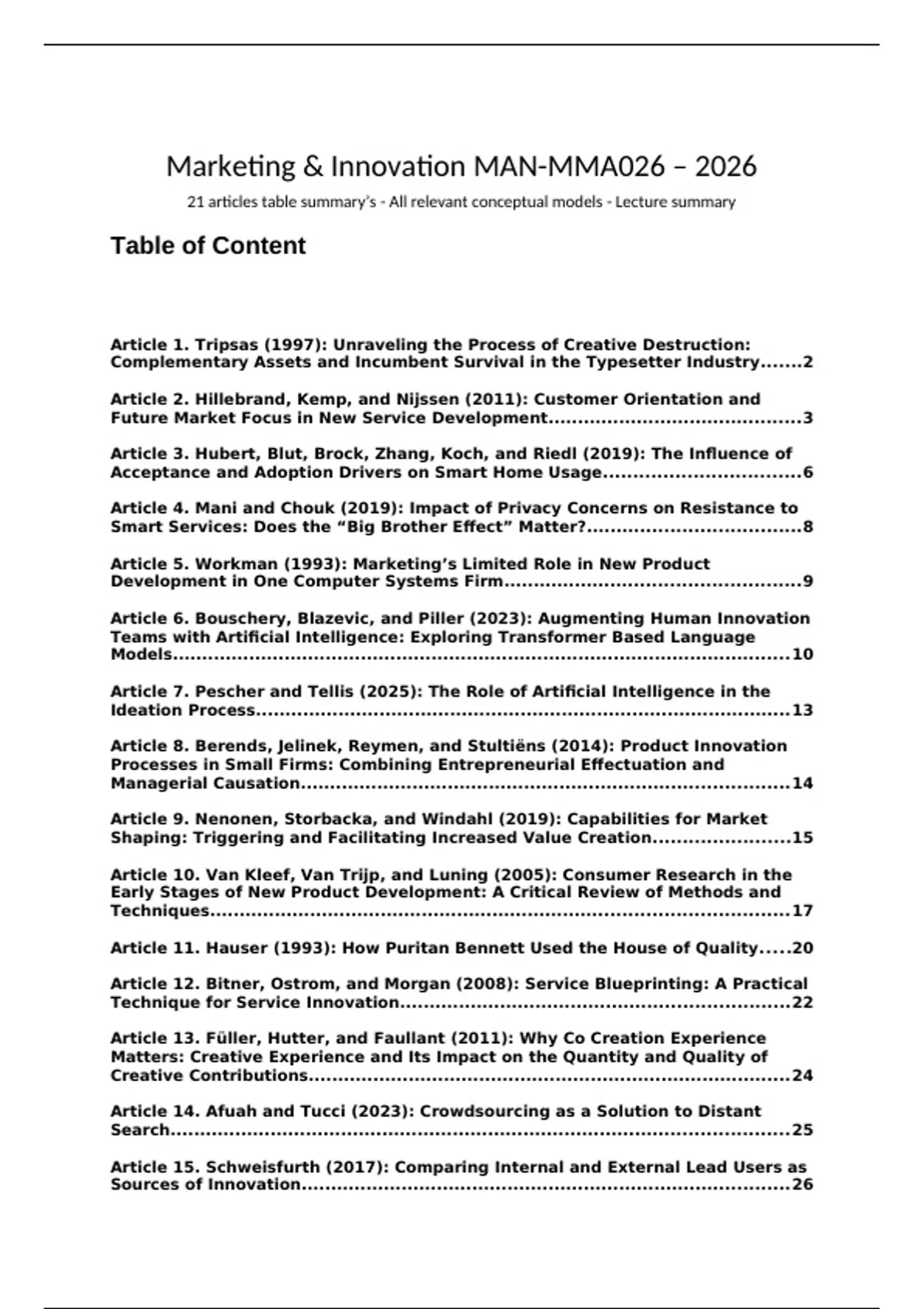 This document provides a complete and exam focused summary for the course Marketing and Innovation MAN MMA026 written in 2026. All 21 mandatory exam articles are condensed into one clear table per article, each capturing the key concepts, mechanisms, findings, and implications required for the exam. For articles that include a relevant conceptual model, the full model is added to support understanding of relationships and logic. In addition, all lectures are summarized into concise and structured overviews. Together, this summary is designed as a standalone study resource that covers everything needed to prepare effectively for the exam. Good luck!