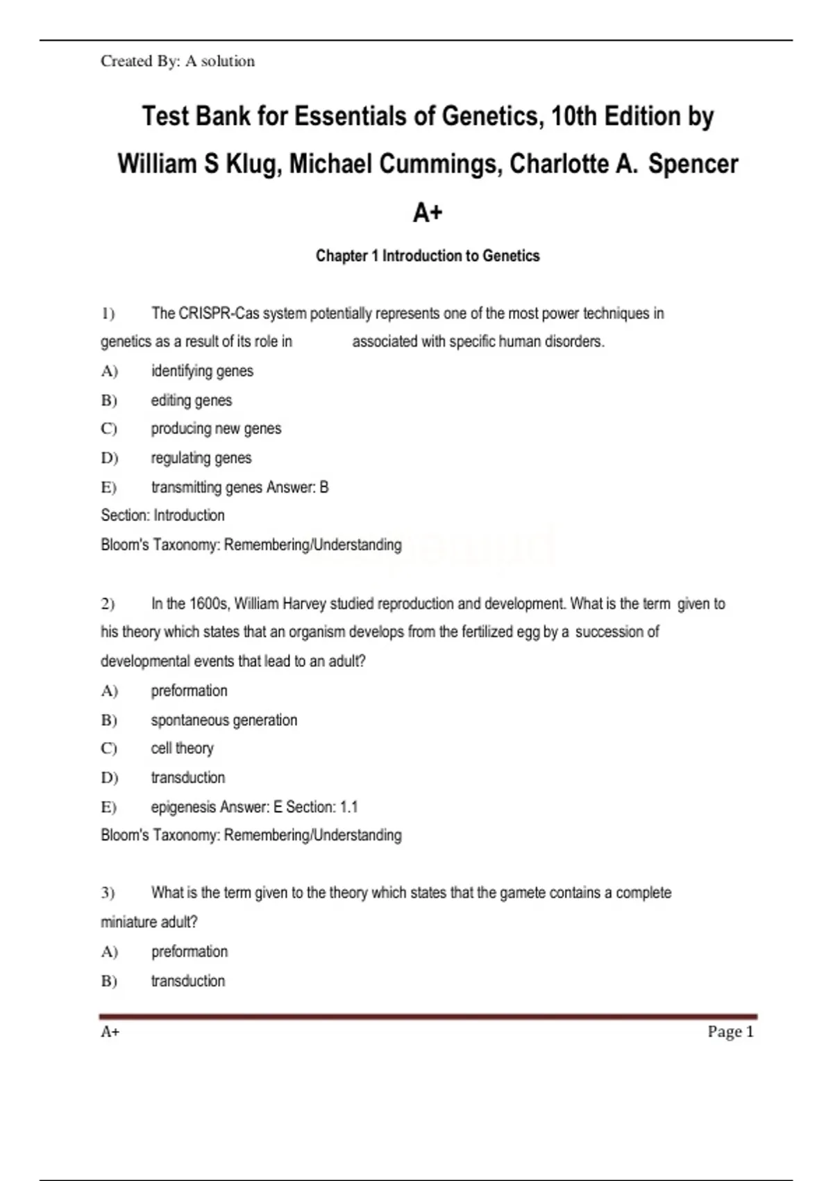 Test Bank for Essentials of Genetics, 10th Edition by
