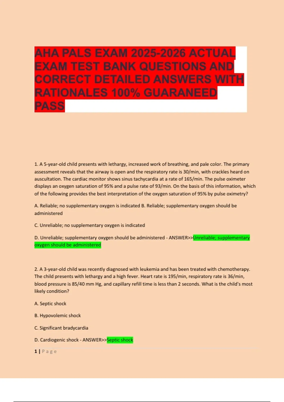 1. A 5-year-old child presents with lethargy, increased work of breathing, and pale color. The primary