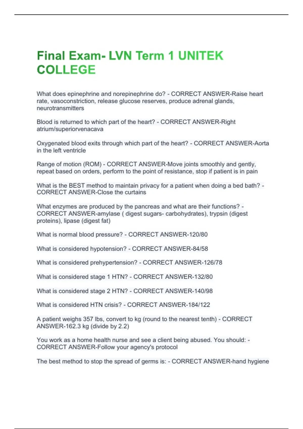 Final Exam- LVN Term 1 UNITEK COLLEGE QUESTIONS WITH 100% VERIFIED ANSWERS!!