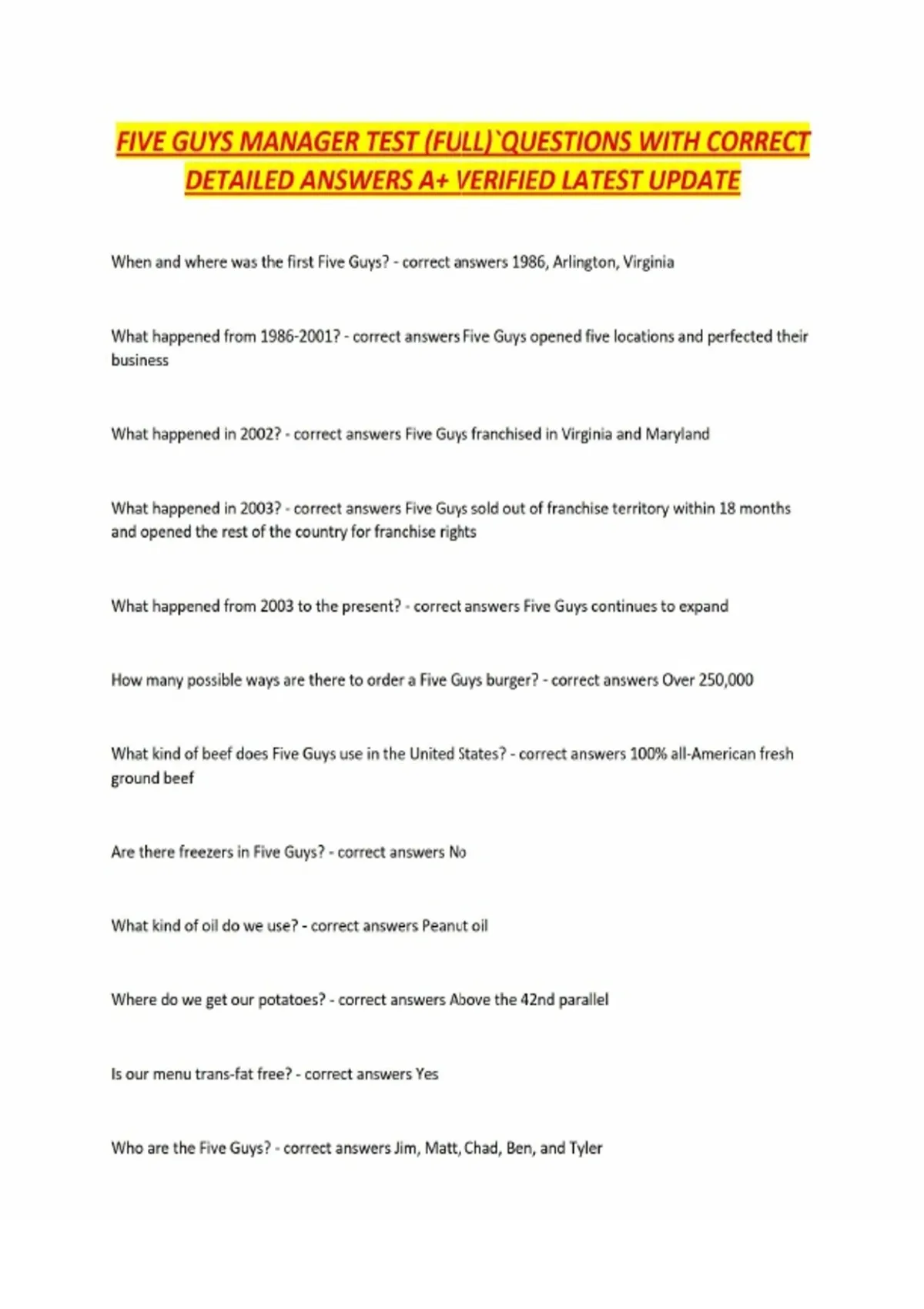 FIVE GUYS MANAGER TEST (FULL)`QUESTIONS WITH CORRECT DETAILED ANSWERS A+ VERIFIED LATEST UPDATE FIVE GUYS MANAGER TEST (FULL)`QUESTIONS WITH CORRECT DETAILED ANSWERS A+ VERIFIED LATEST UPDATEFIVE GUYS MANAGER TEST (FULL)`QUESTIONS WITH CORRECT DETAILED ANSWERS A+ VERIFIED LATEST UPDATEFIVE GUYS MANAGER TEST (FULL)`QUESTIONS WITH CORRECT DETAILED ANSWERS A+ VERIFIED LATEST UPDATE