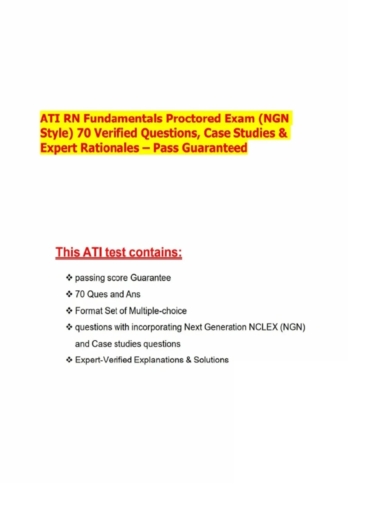 ATI RN Fundamentals Proctored Exam (NGN Style) 70 Verified Questions, Case Studies & Expert Rationales – Pass Guaranteed exam 2Prepare with confidence for your ATI RN Fundamentals Proctored Exam using this Next Generation NCLEX (NGN) style resource, designed to mirror the actual exam format and guarantee success. This prep set includes 70 verified multiple‑choice questions (MCQs), case studies, and expert‑verified rationales to ensure you’re ready to pass on the first attempt. Features: - 70 Actual Questions & Answers with structured rationales - 100% Pass Guarantee for exam readiness - NGN‑Style Case Scenarios & Focused Assessments integrated into the question set - Expert‑Verified Rationales explaining correct and incorrect answers - Evidence‑Based Content aligned with ATI and NCLEX standards - Accessible Format for flexible study anytime, anywhere Sample Topics Covered: - Oncology & Labs: Chemotherapy client with thrombocytopenia (platelet count risk for bleeding) - Legal & Ethics: Advance directives and HIPAA compliance in documentation - Assistive Devices: Correct cane use, hearing aid safety, ankle‑foot orthotics for contracture prevention - Infection Control: TB airborne precautions (negative‑pressure rooms) - Medication Administration: Otic medication technique, insulin mixing ordered response, oral liquid medication safety - Client Safety: Fall risk assessments in older adults, vision testing for safety needs