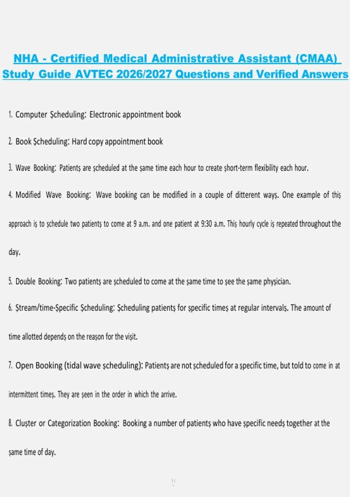 This study guide is designed for the NHA Certified Medical Administrative Assistant (CMAA) exam and aligns with AVTEC coursework for the 2026/2027 academic year. It includes exam-style questions with verified answers covering essential medical administrative skills, office procedures, compliance, and patient communication.