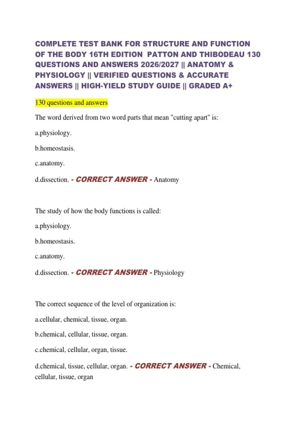 COMPLETE TEST BANK FOR STRUCTURE AND FUNCTION OF THE BODY 16TH EDITION PATTON AND THIBODEAU 130 QUESTIONS AND ANSWERS 2026/2027 || ANATOMY & PHYSIOLOGY || VERIFIED QUESTIONS & ACCURATE ANSWERS || HIGH-YIELD STUDY GUIDE || GRADED A+ 130 questions and answers The word derived from two word parts that mean "cutting apart" is: ology. stasis. my. ction. - CORRECT ANSWER - Anatomy
