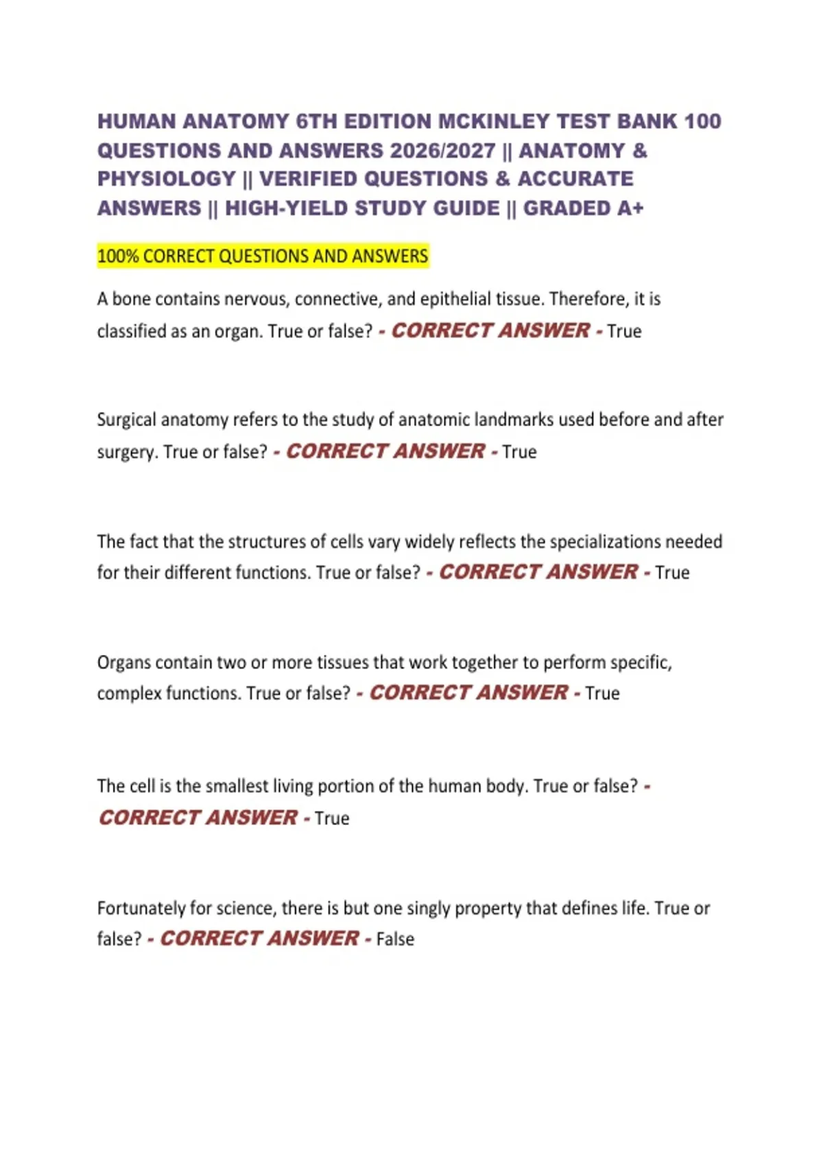 HUMAN ANATOMY 6TH EDITION MCKINLEY TEST BANK 100 QUESTIONS AND ANSWERS 2026/2027 || ANATOMY & PHYSIOLOGY || VERIFIED QUESTIONS & ACCURATE ANSWERS || HIGH-YIELD STUDY GUIDE || GRADED A+ 100% CORRECT QUESTIONS AND ANSWERS A bone contains nervous, connective, and epithelial tissue. Therefore, it is classified as an organ. True or false? - CORRECT ANSWER - True